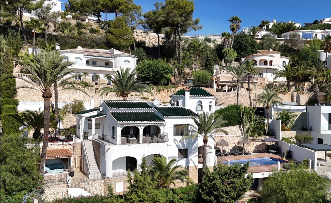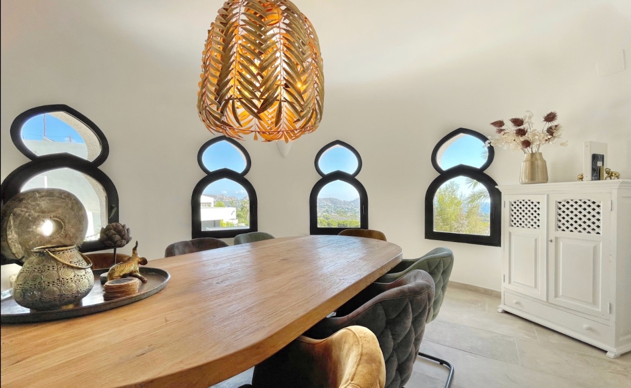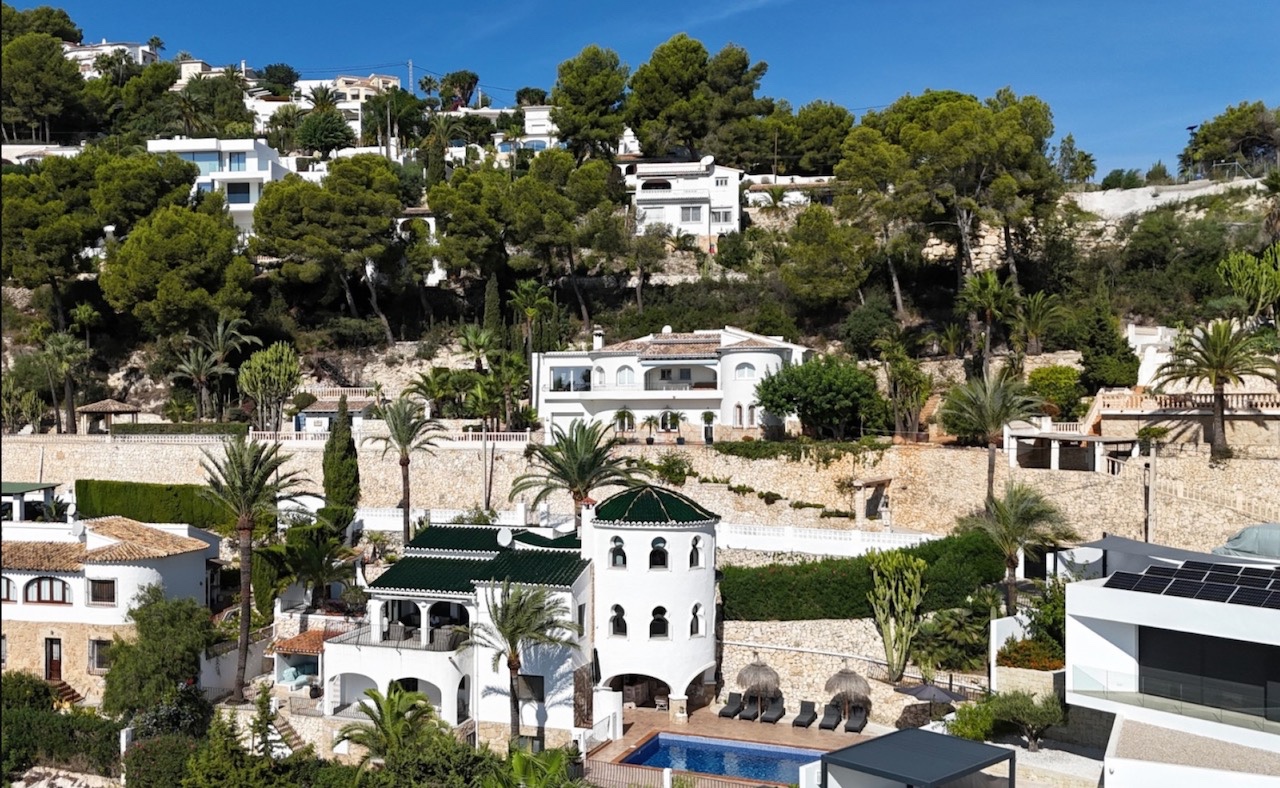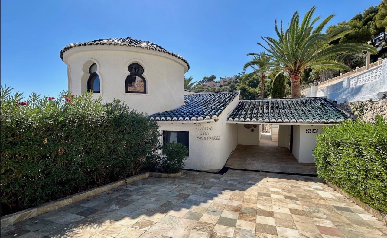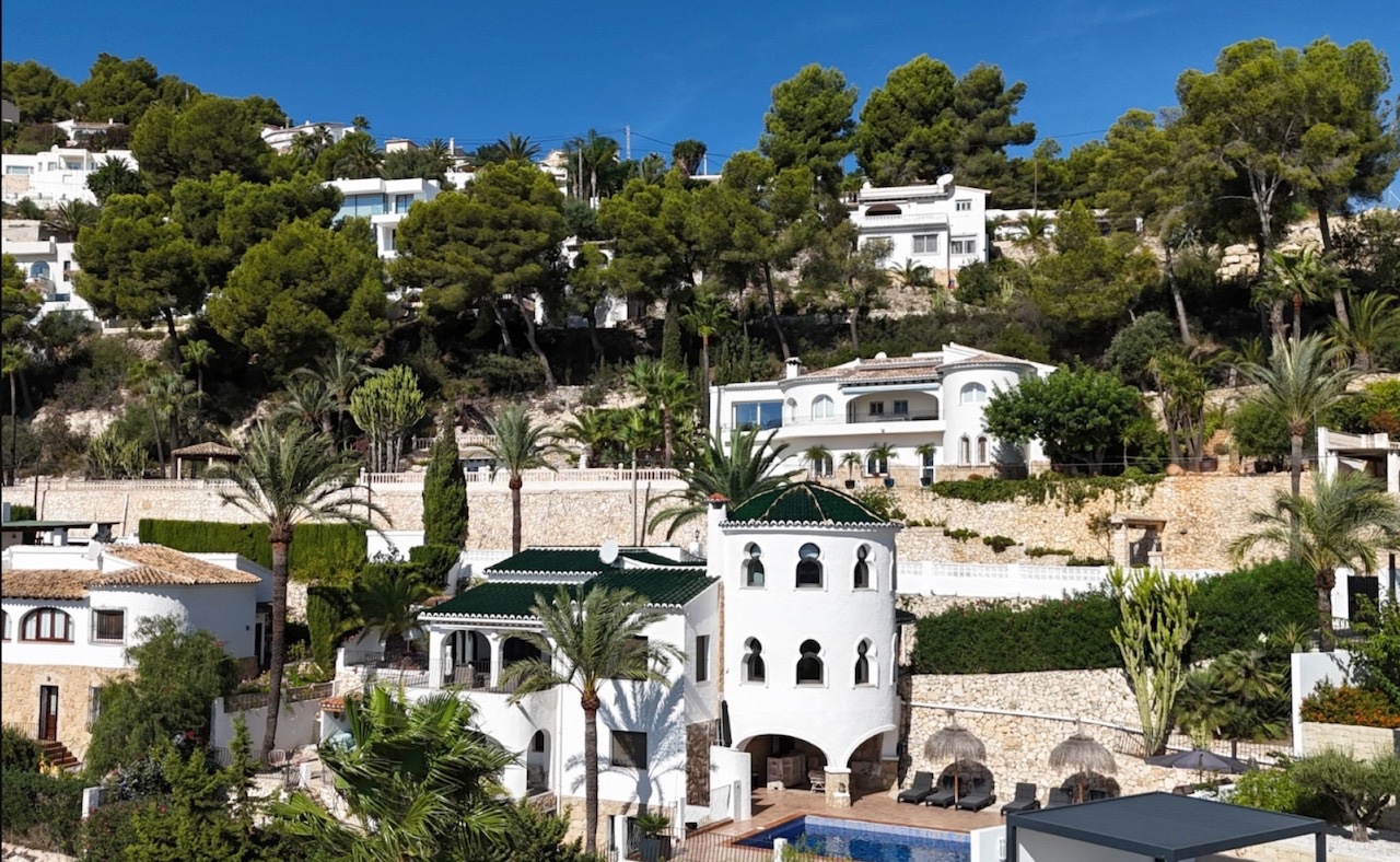 This charming villa in the highly sought-after Benimeit area of Moraira offers stunning views of the town, surrounding greenery, and the Mediterranean Sea. Its Arabic-style windows and traditional green roof tiles give the property a unique character.