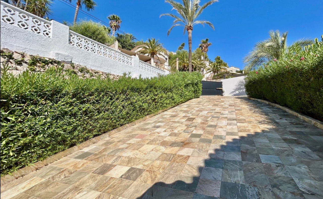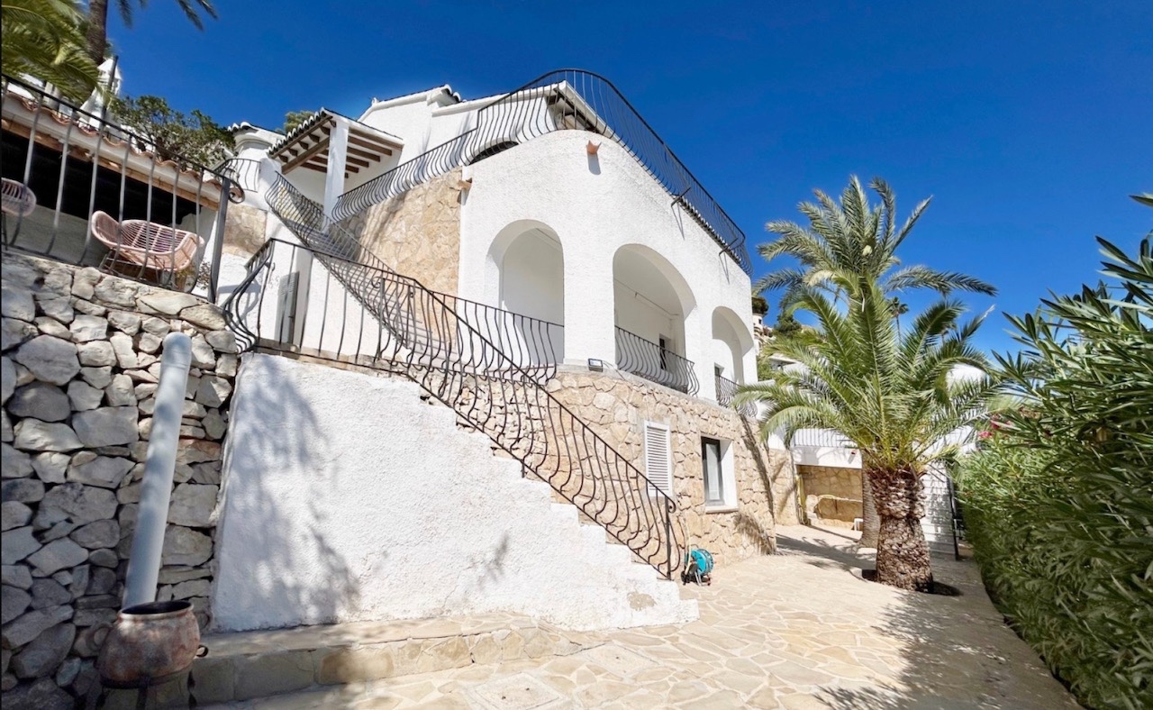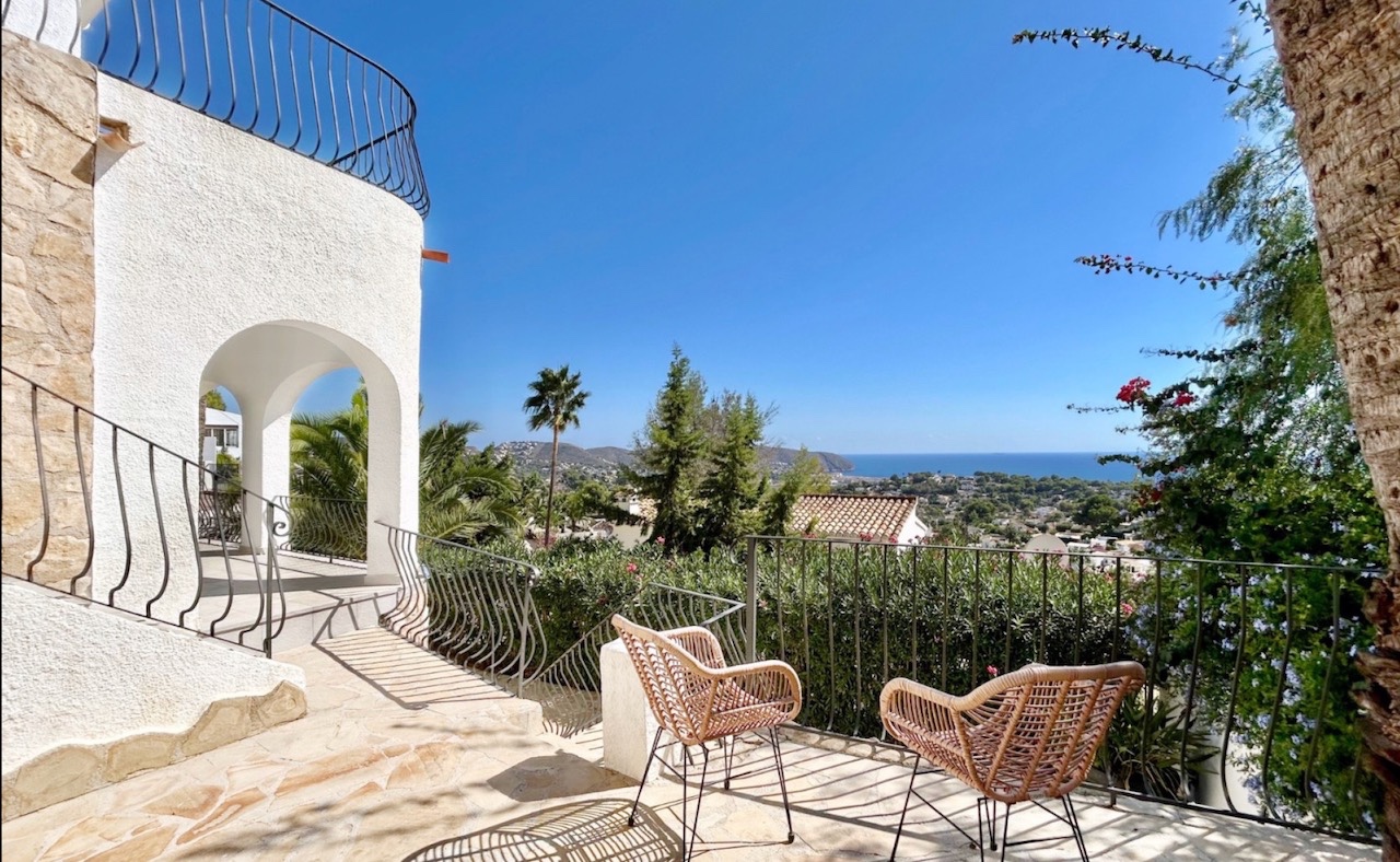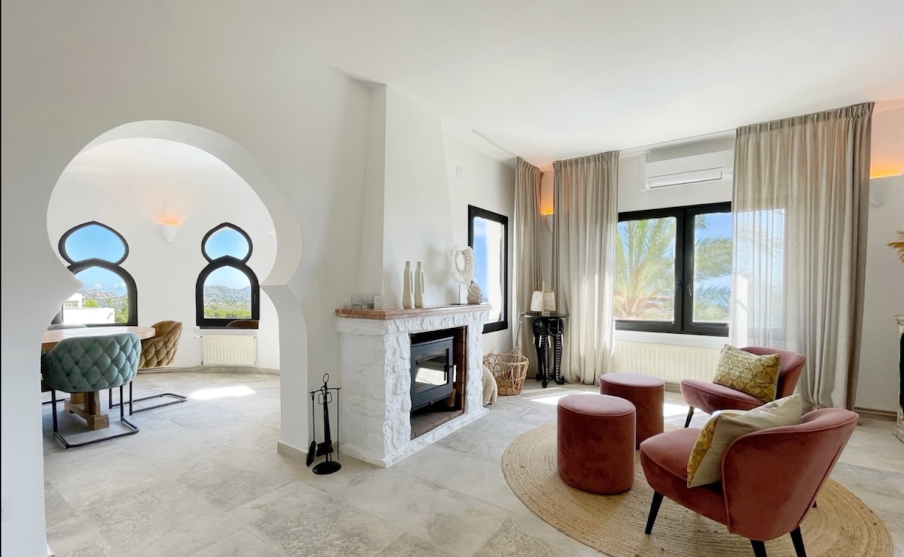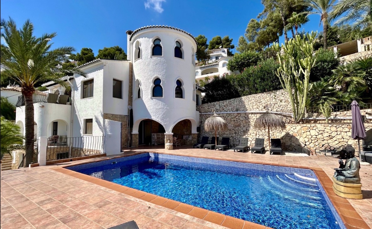 This charming villa in the highly sought-after Benimeit area of Moraira offers stunning views of the town, surrounding greenery, and the Mediterranean Sea. Its Arabic-style windows and traditional green roof tiles give the property a unique character.