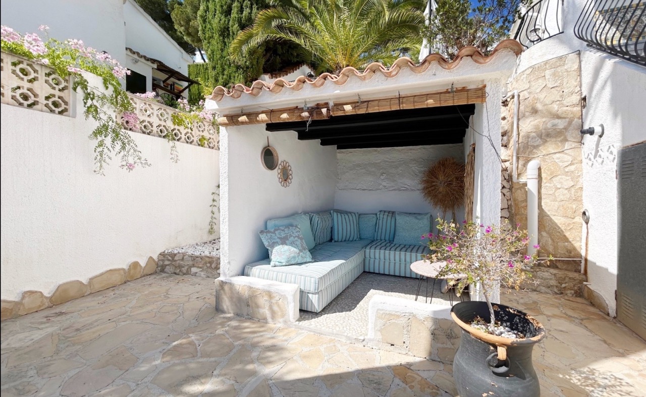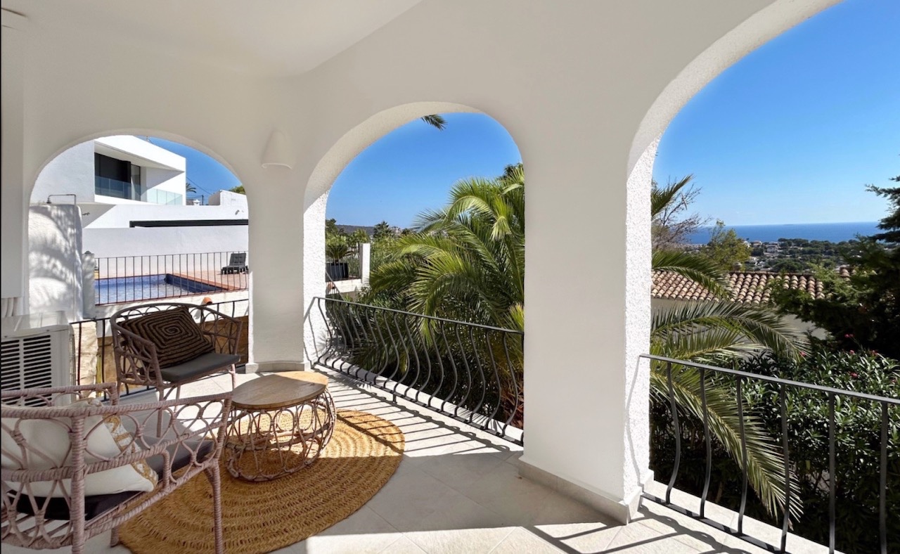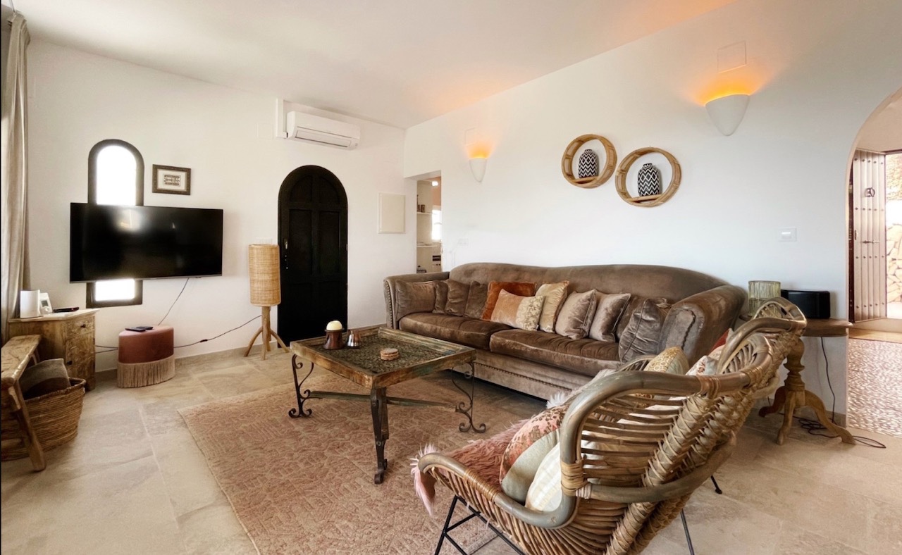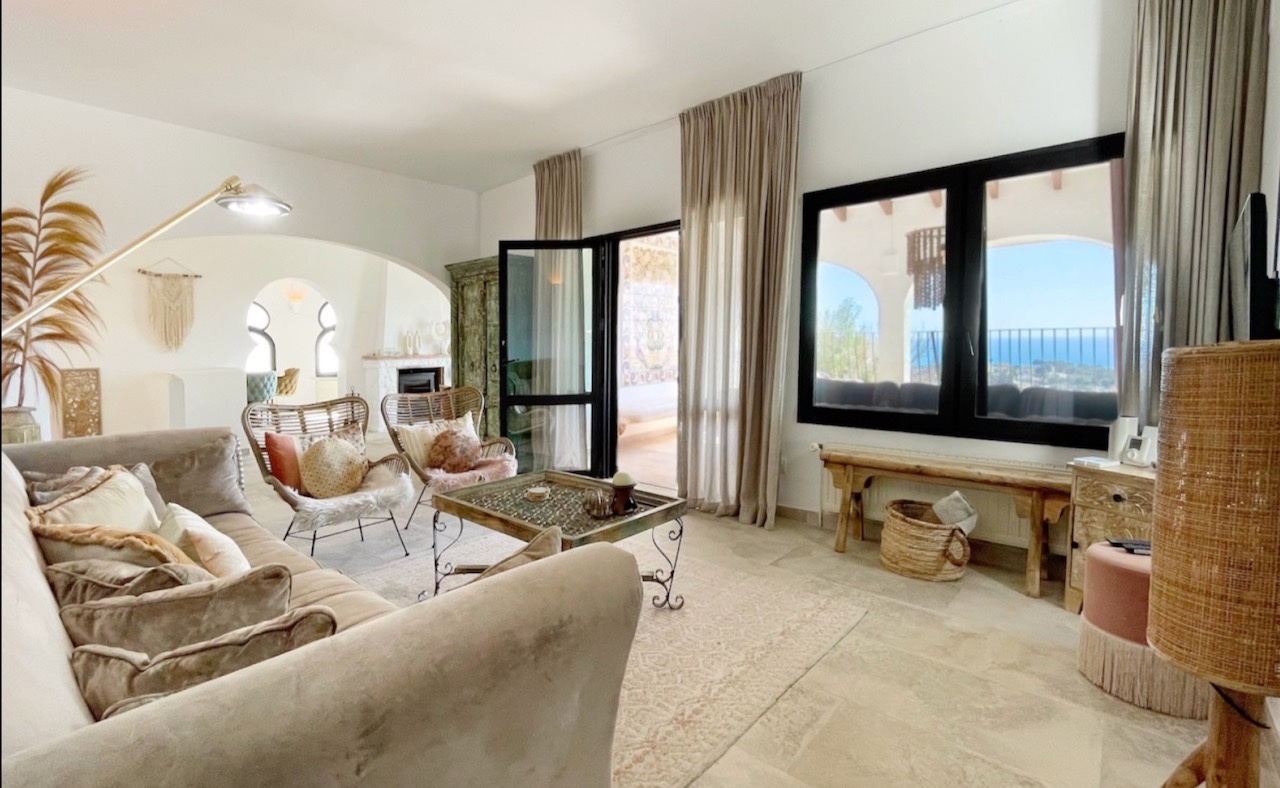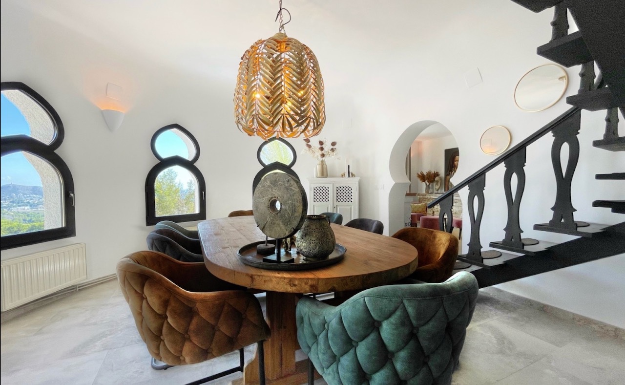 This charming villa in the highly sought-after Benimeit area of Moraira offers stunning views of the town, surrounding greenery, and the Mediterranean Sea. Its Arabic-style windows and traditional green roof tiles give the property a unique character.
