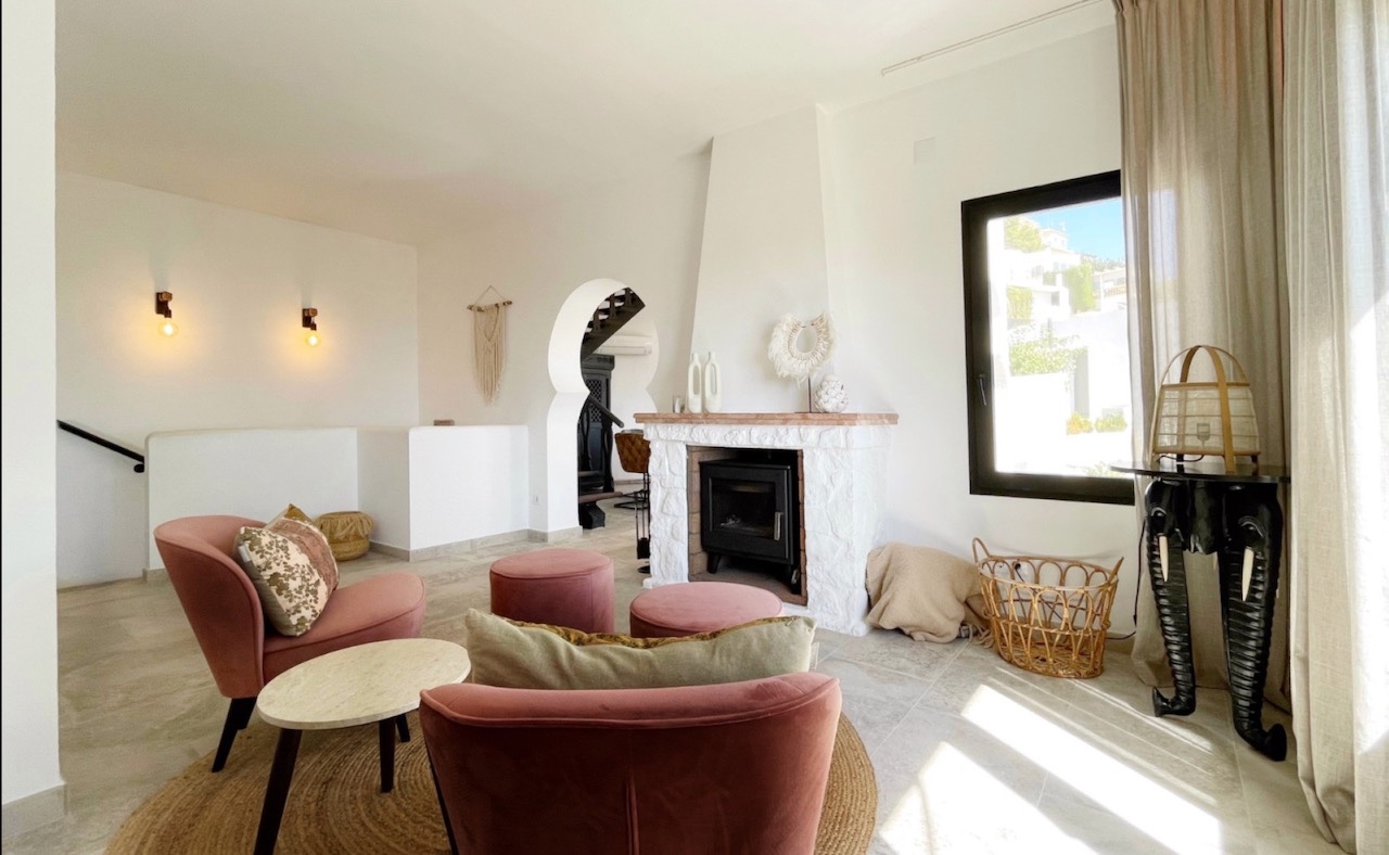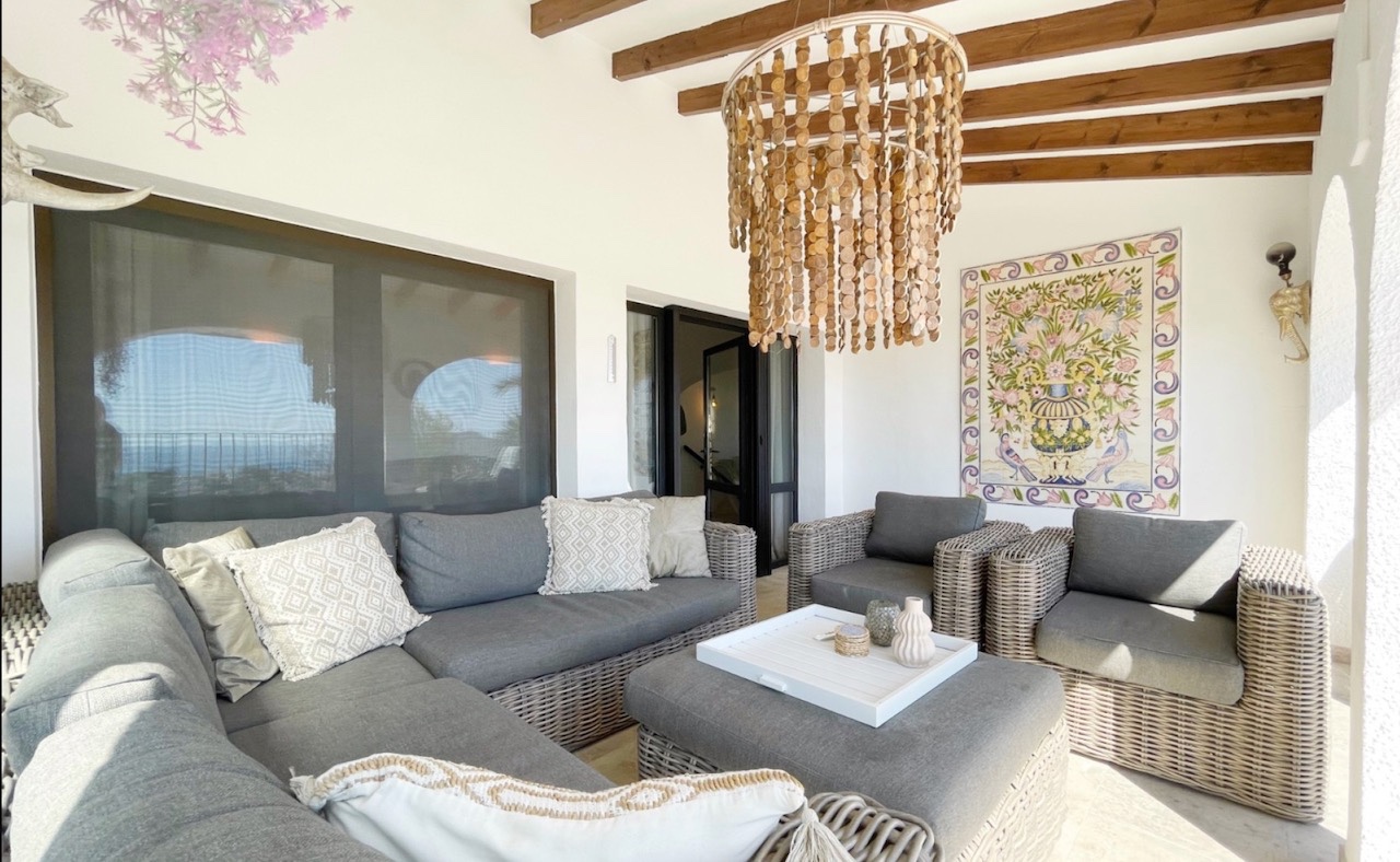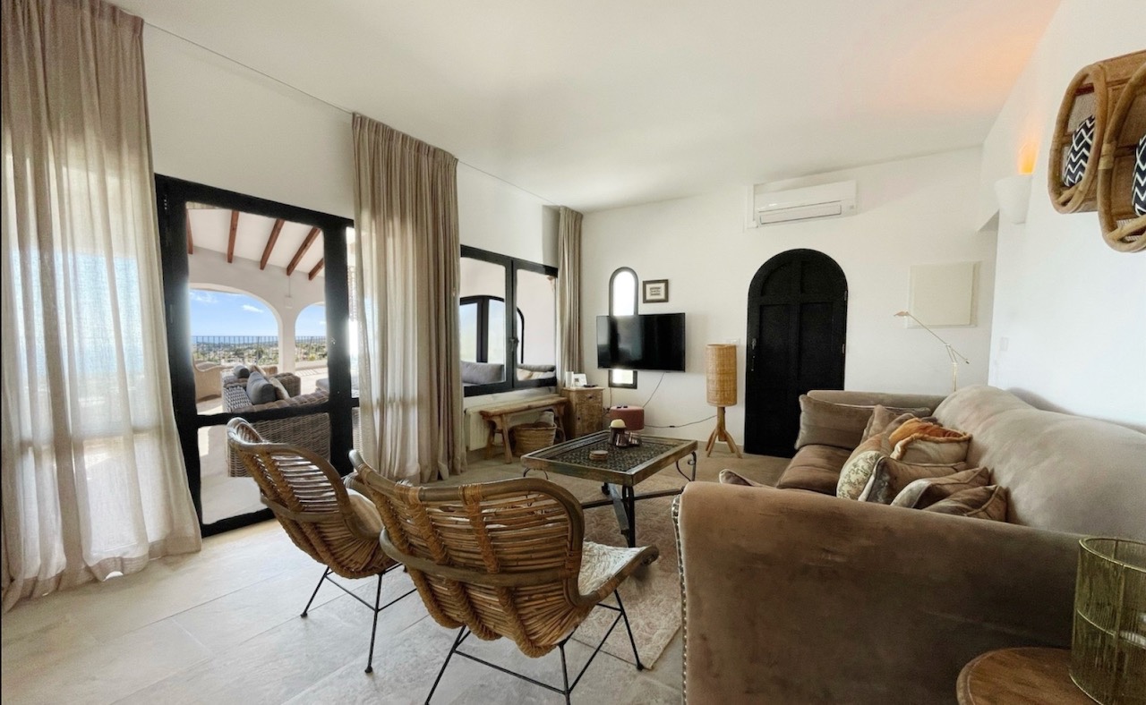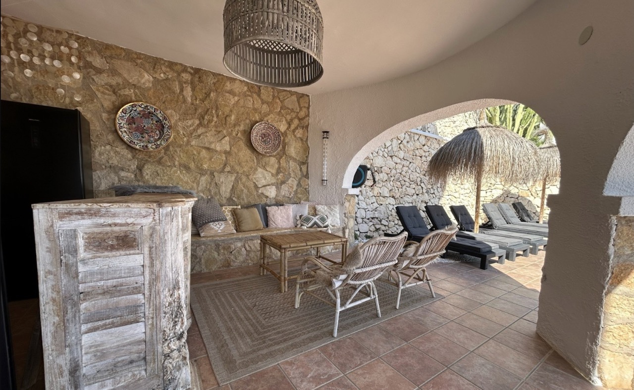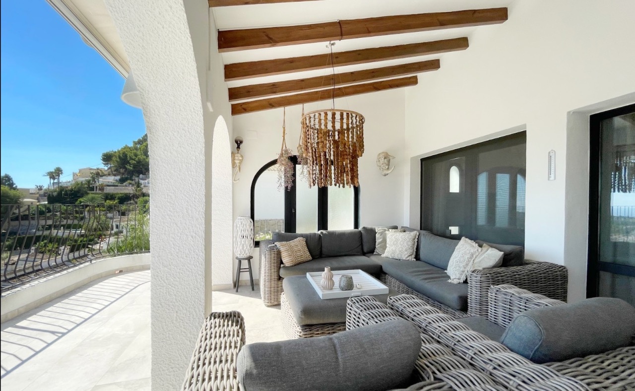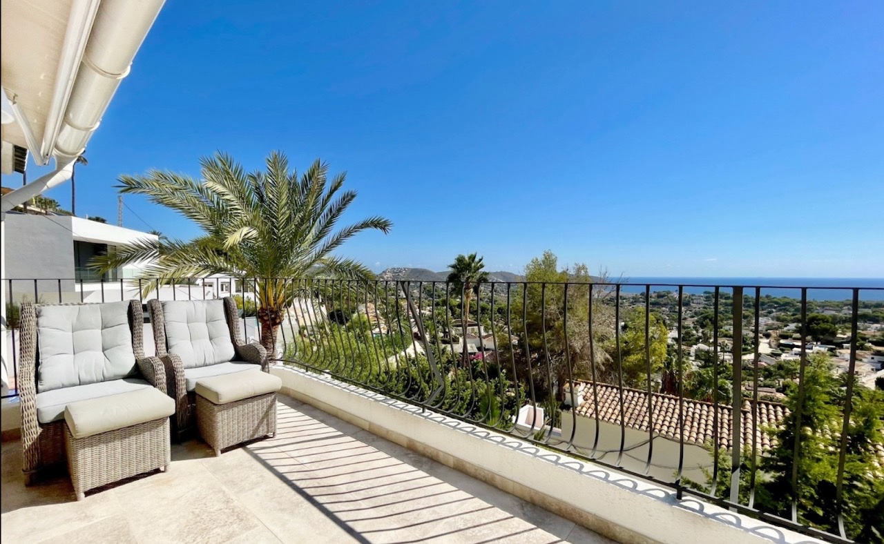 This charming villa in the highly sought-after Benimeit area of Moraira offers stunning views of the town, surrounding greenery, and the Mediterranean Sea. Its Arabic-style windows and traditional green roof tiles give the property a unique character.