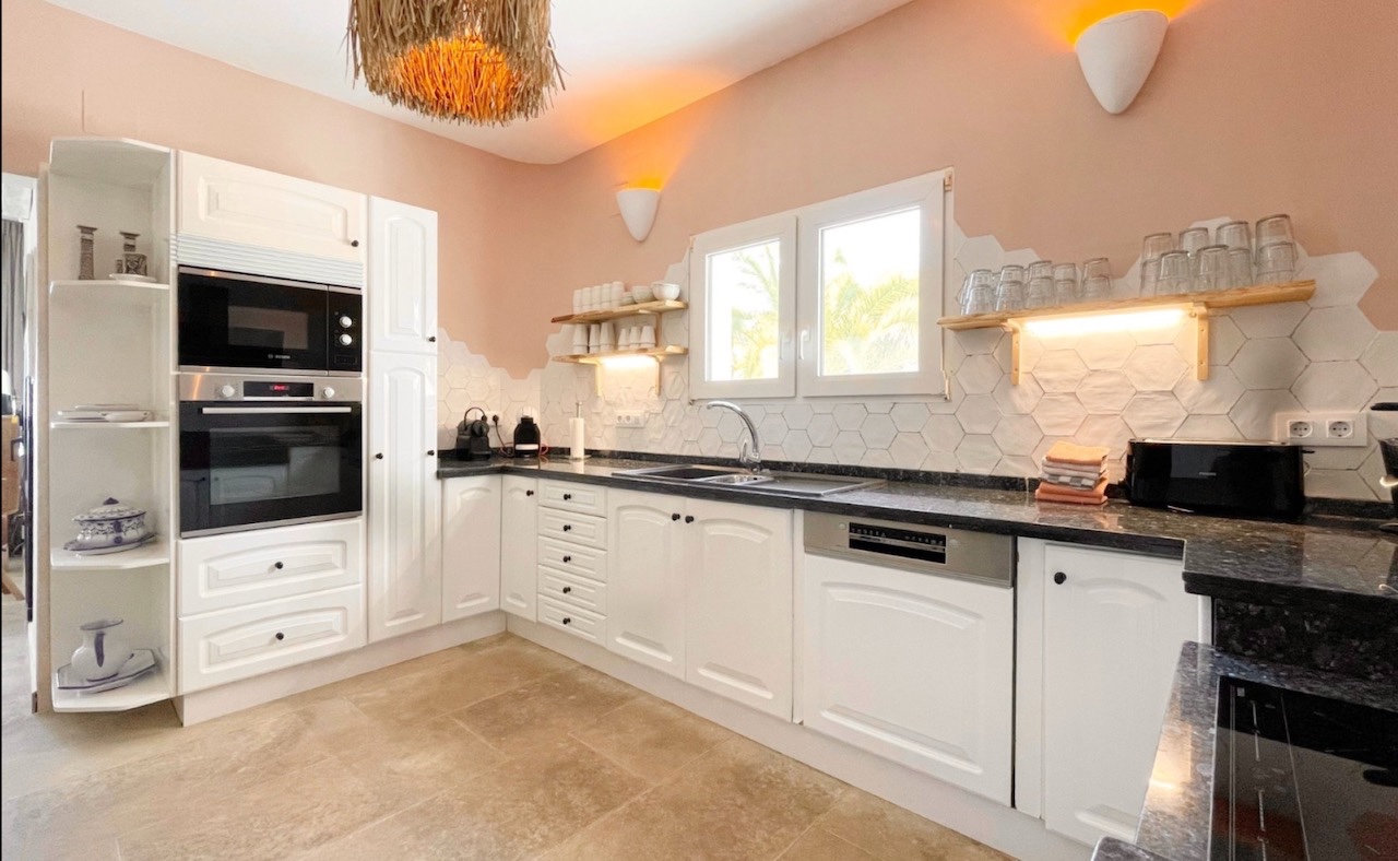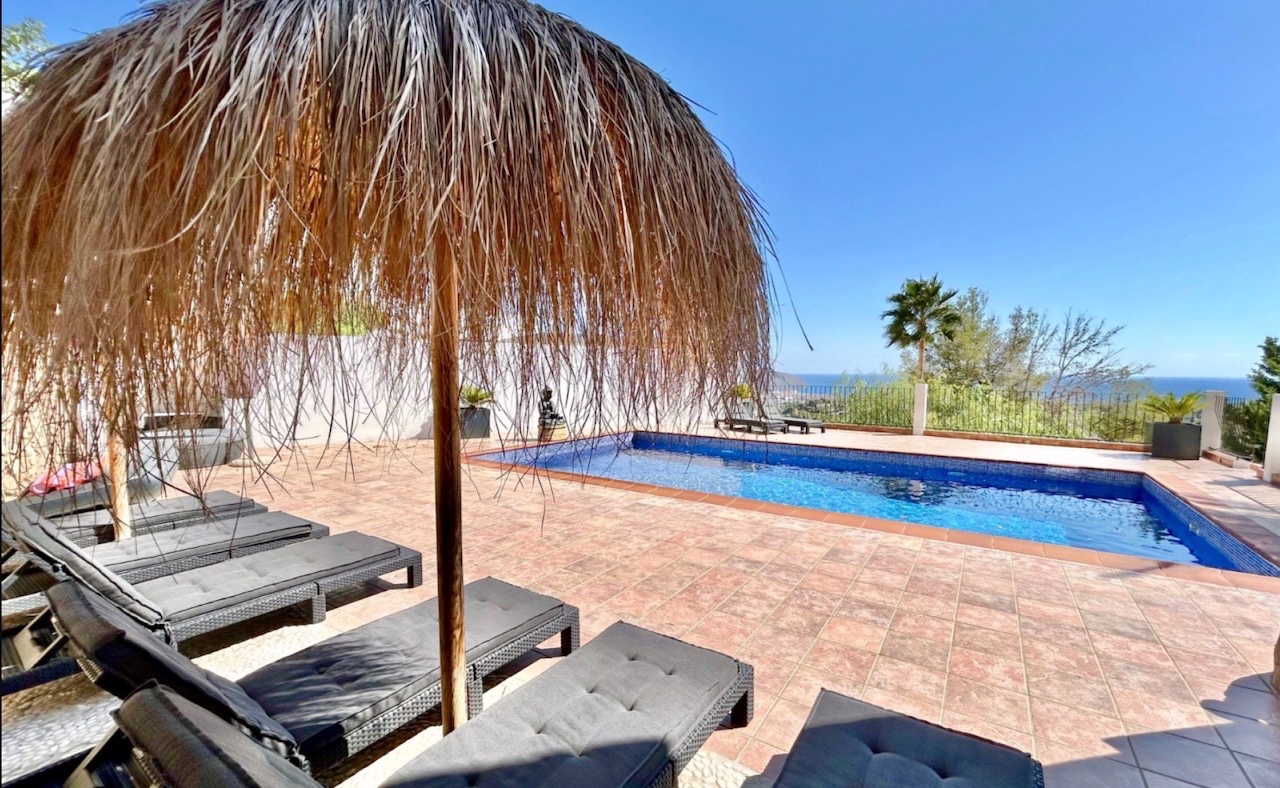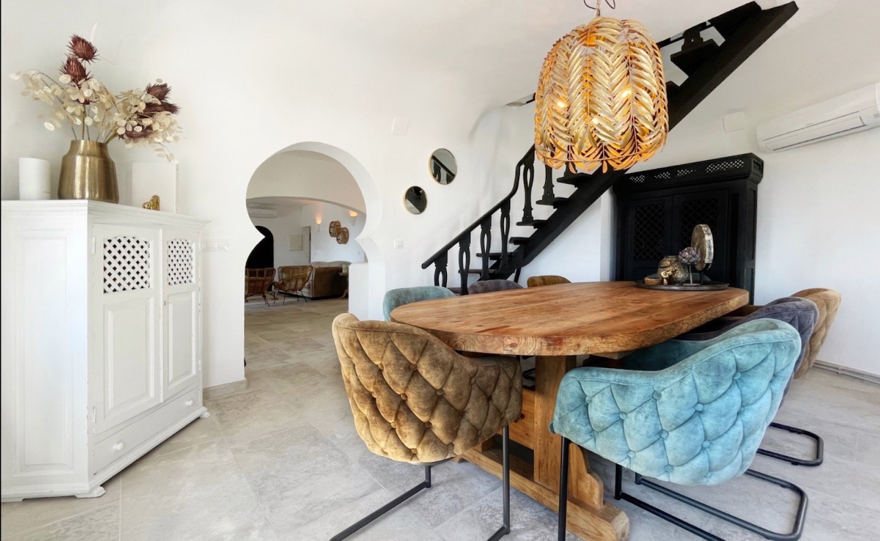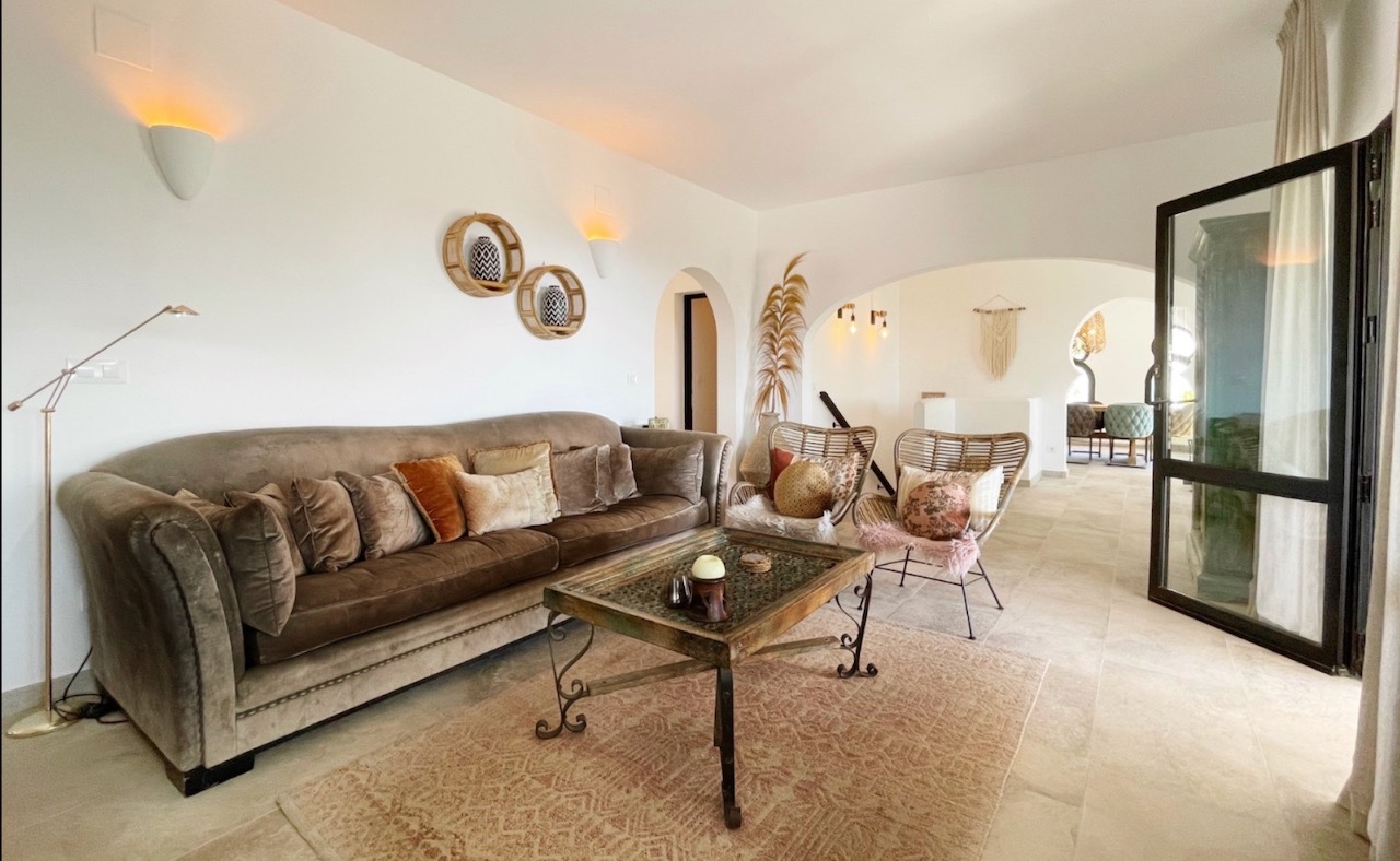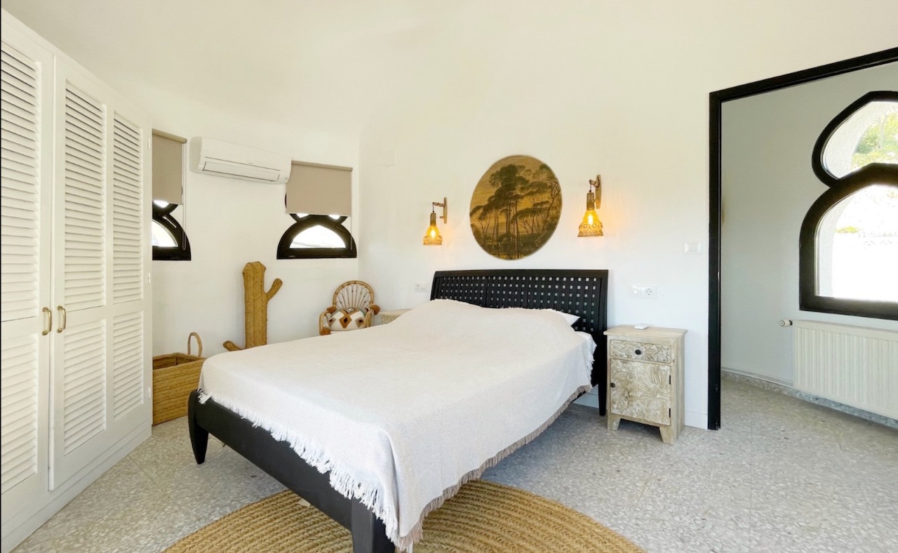This charming villa in the highly sought-after Benimeit area of Moraira offers stunning views of the town, surrounding greenery, and the Mediterranean Sea. Its Arabic-style windows and traditional green roof tiles give the property a unique character.