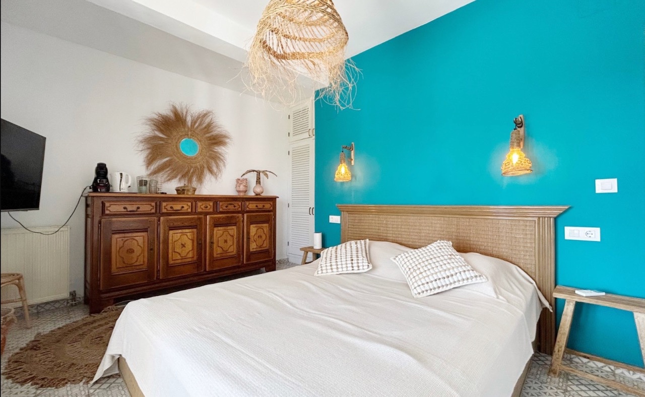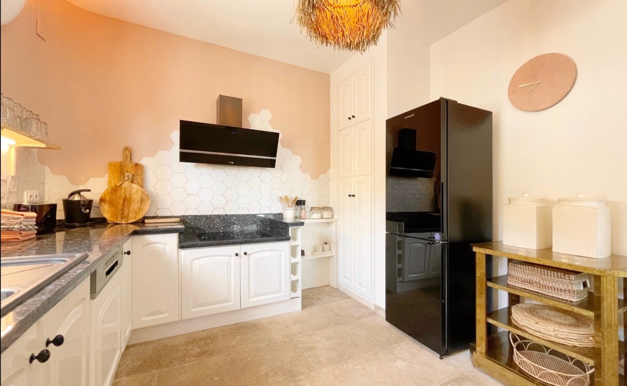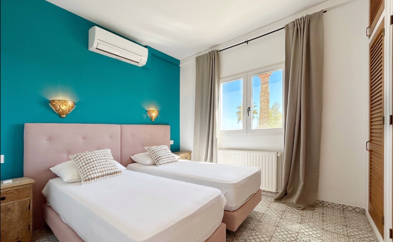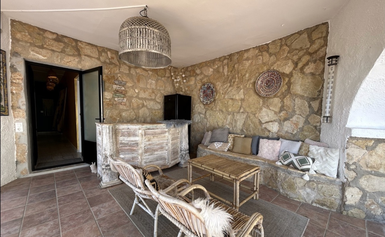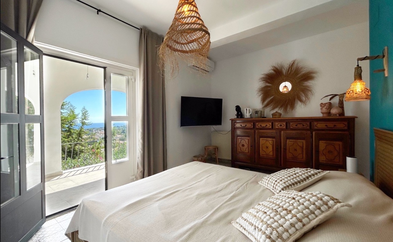 This charming villa in the highly sought-after Benimeit area of Moraira offers stunning views of the town, surrounding greenery, and the Mediterranean Sea. Its Arabic-style windows and traditional green roof tiles give the property a unique character.