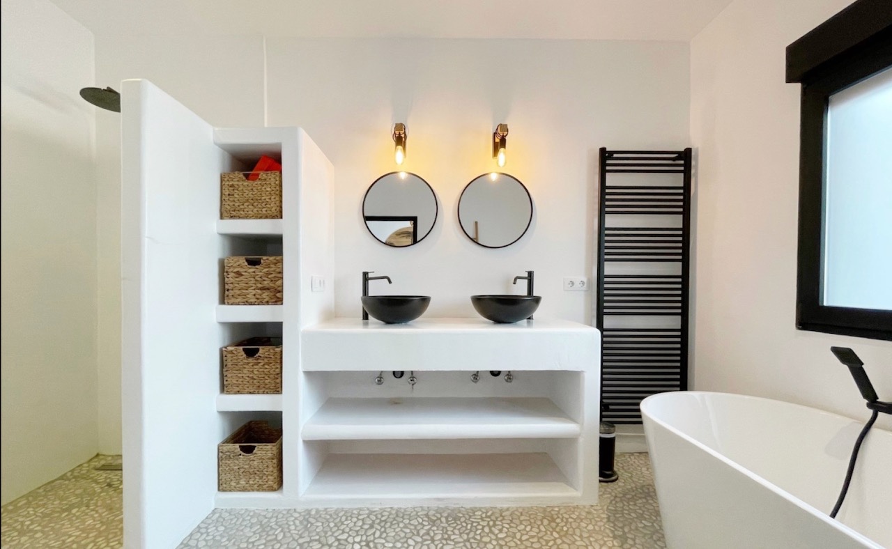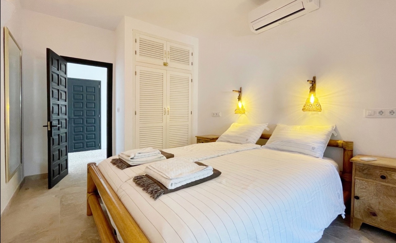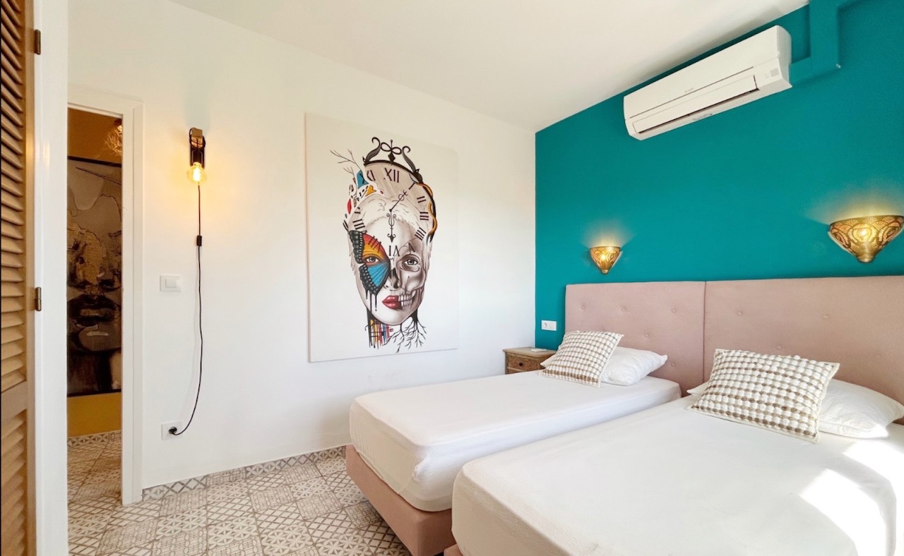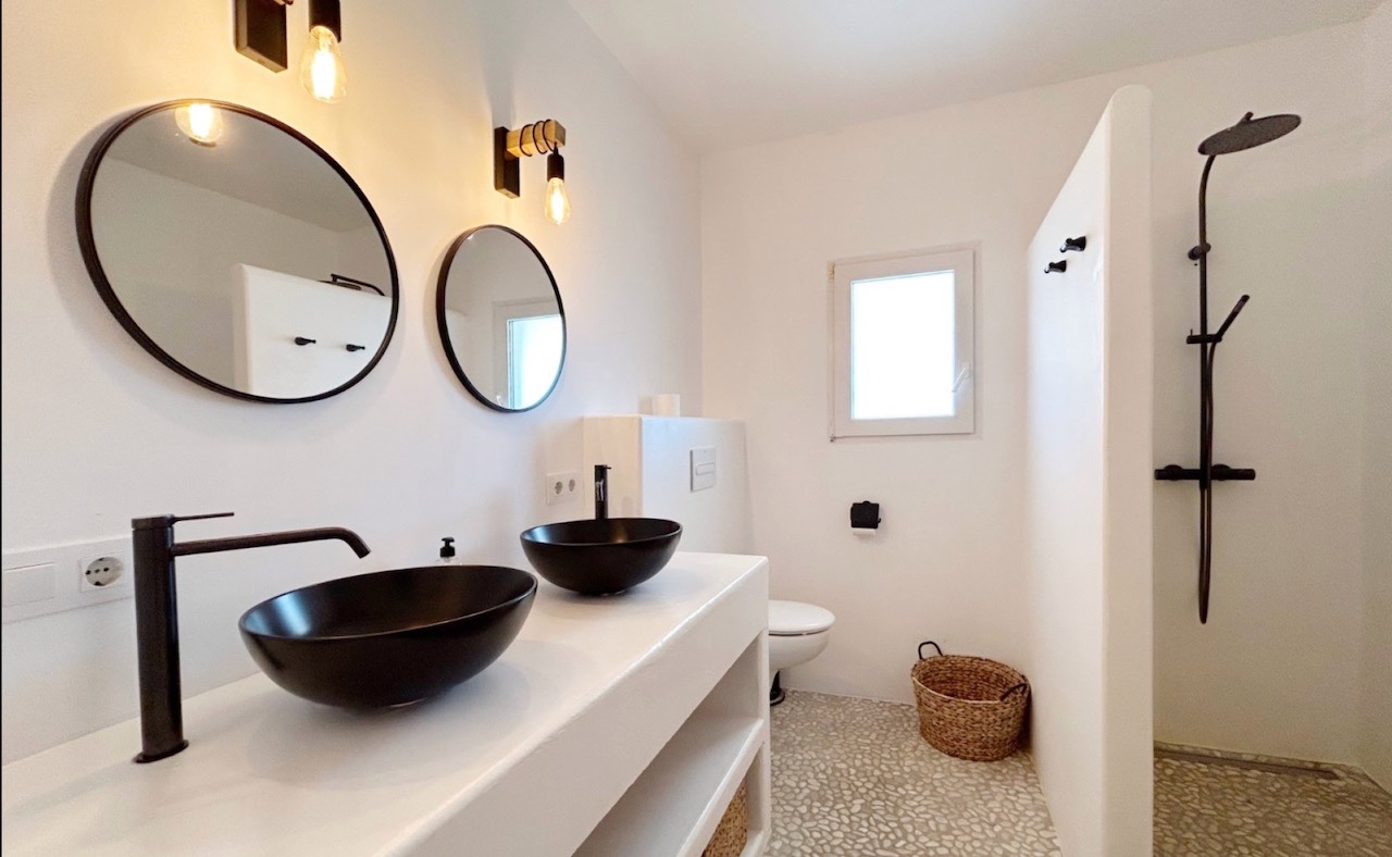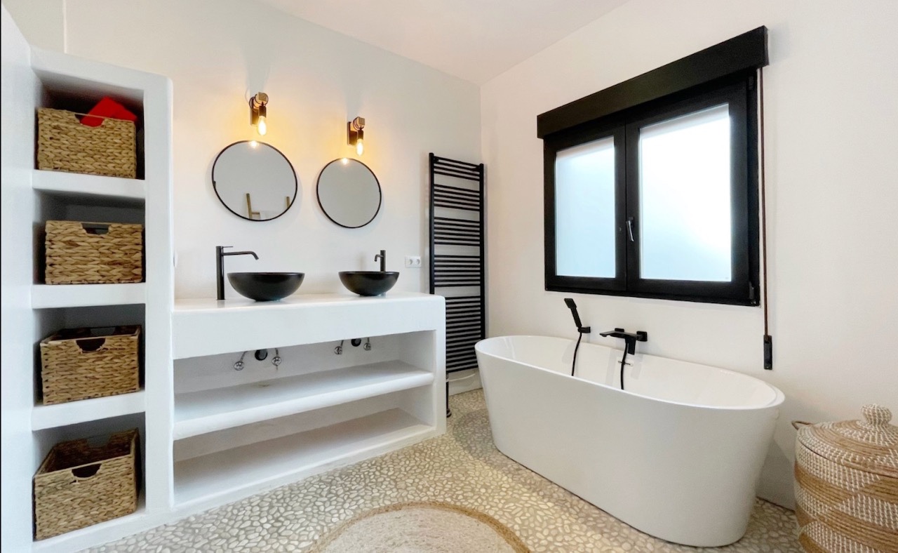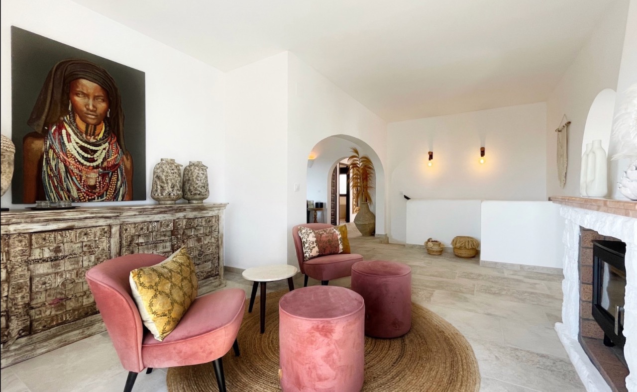 The main floor features an open-plan layout with a spacious living room opening to the naya, a fireplace sitting room, large dining area, and fully equipped kitchen. A bedroom, bathroom with bath and separate shower, and guest toilet complete this level, along with a staircase to the tower room—currently a bedroom with panoramic views, also suitable as an office.