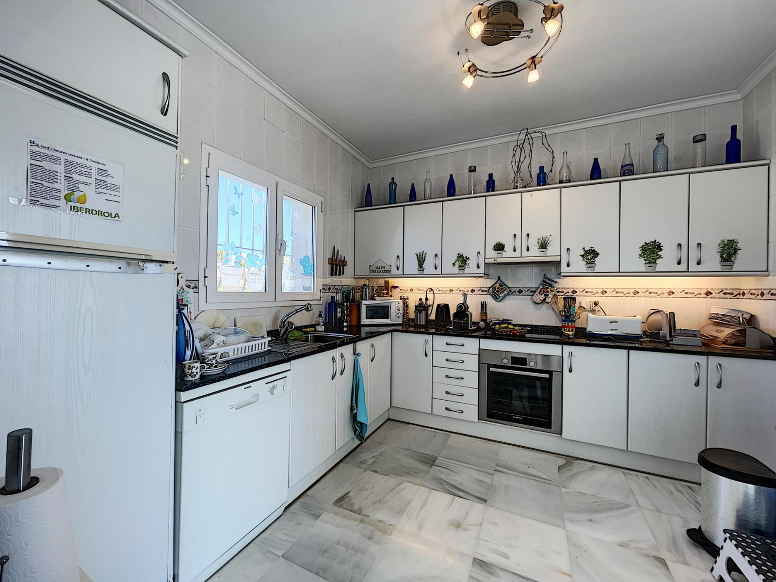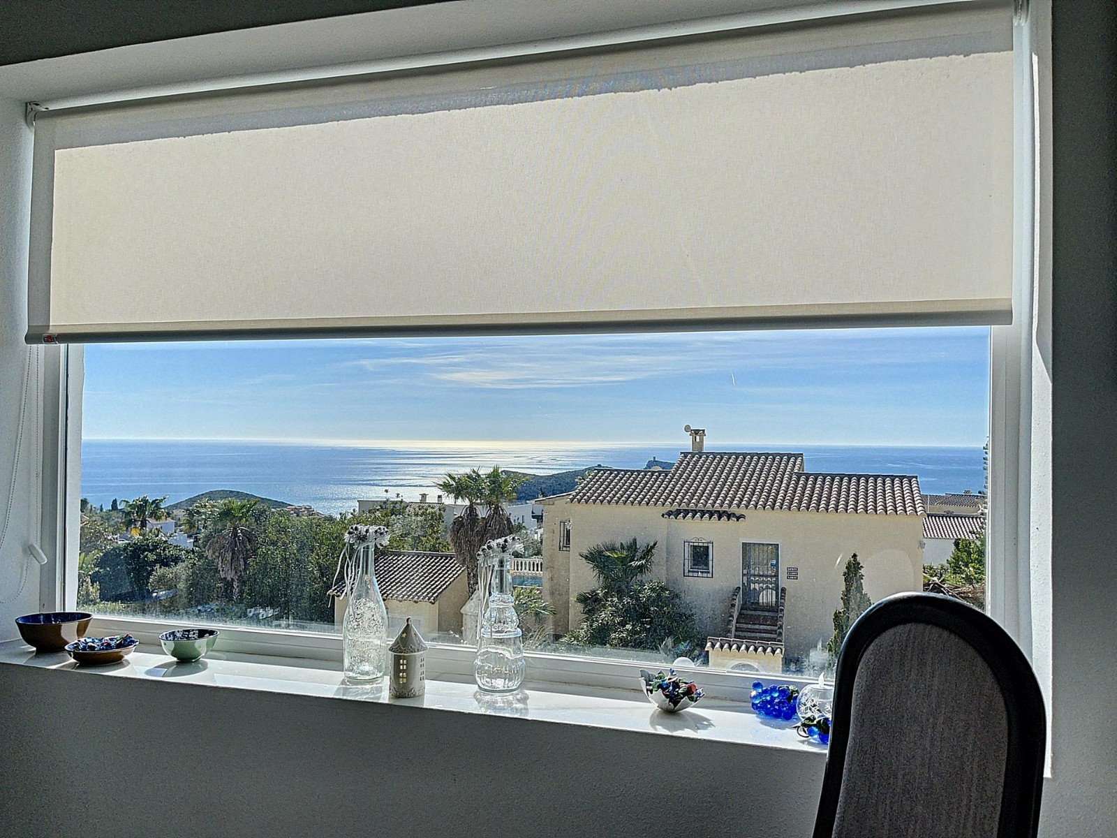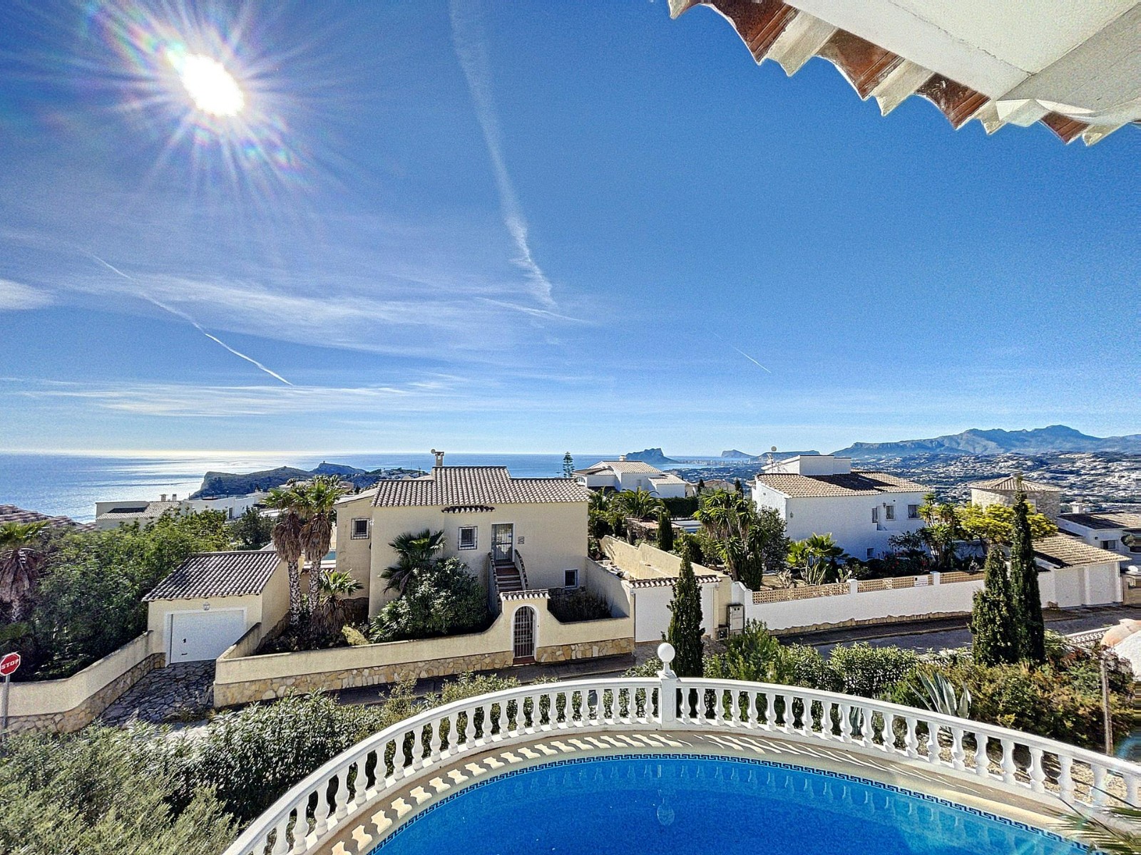 Magnificent south-facing villa located in Kalmias, Cumbre del Sol, offering stunning panoramic sea views and an excellent location close to Moraira and Jávea.The property is distributed over two levels. The ground floor features three double bedrooms, all with fitted wardrobes and en-suite bathrooms, with direct access to the terrace and pool. The main floor offers a bright living-dining area with sea views, a fully equipped independent kitchen, a glazed terrace, and an office space.Outside, the villa boasts a Mediterranean garden, summer kitchen with covered seating area, private 8 x 4 m swimming pool, and a spacious south-facing terrace. Parking for several vehicles is available.Features: central heating, double glazing, shutters, alarm system, private pool, summer kitchen, parking, panoramic sea views.