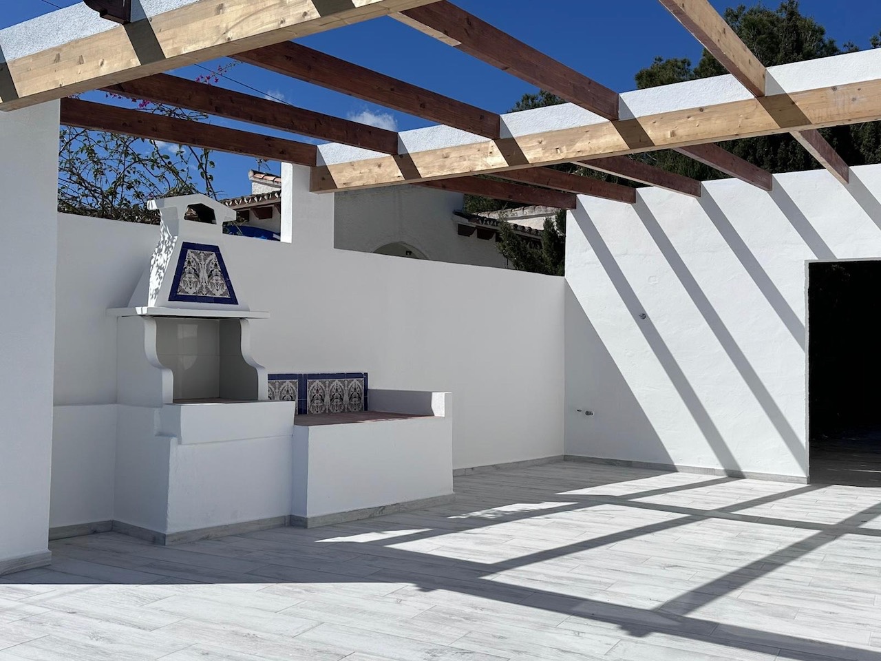 Vanuit de naya heeft u ook toegang tot een overdekte zomerkeuken en eethoek, perfect voor het ontvangen van gasten. Deze leidt naar een groot terras met een ruim zwembad en uitzicht op zee, een uitstekende plek om te genieten van de mediterrane levensstijl. De overdekte barbecueplaats is direct verbonden met het huis, waardoor u het hele jaar door gemakkelijk en aangenaam buiten kunt eten.