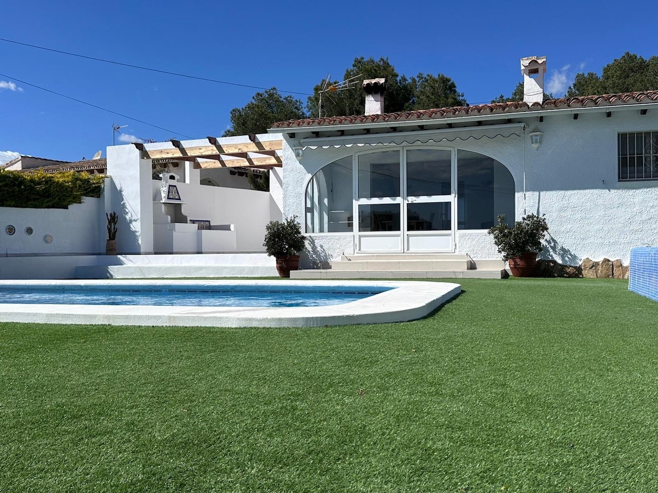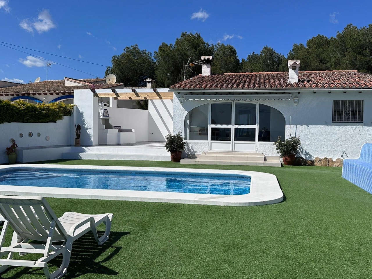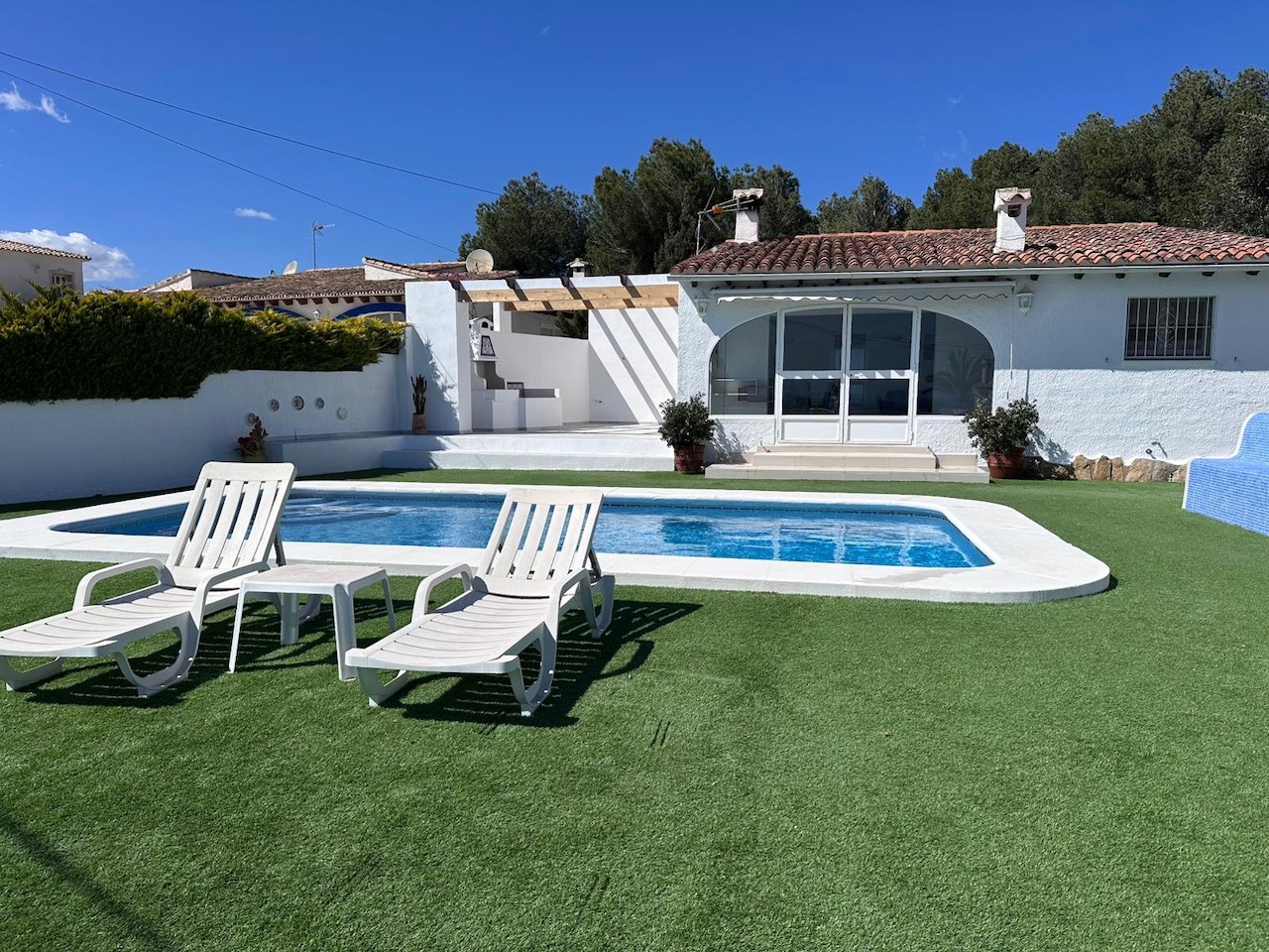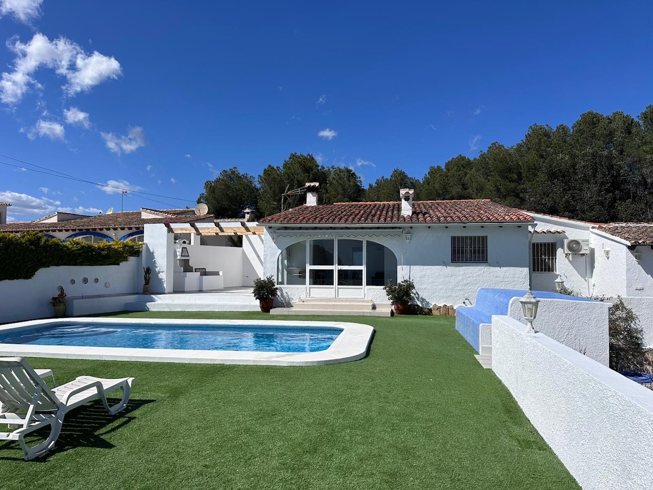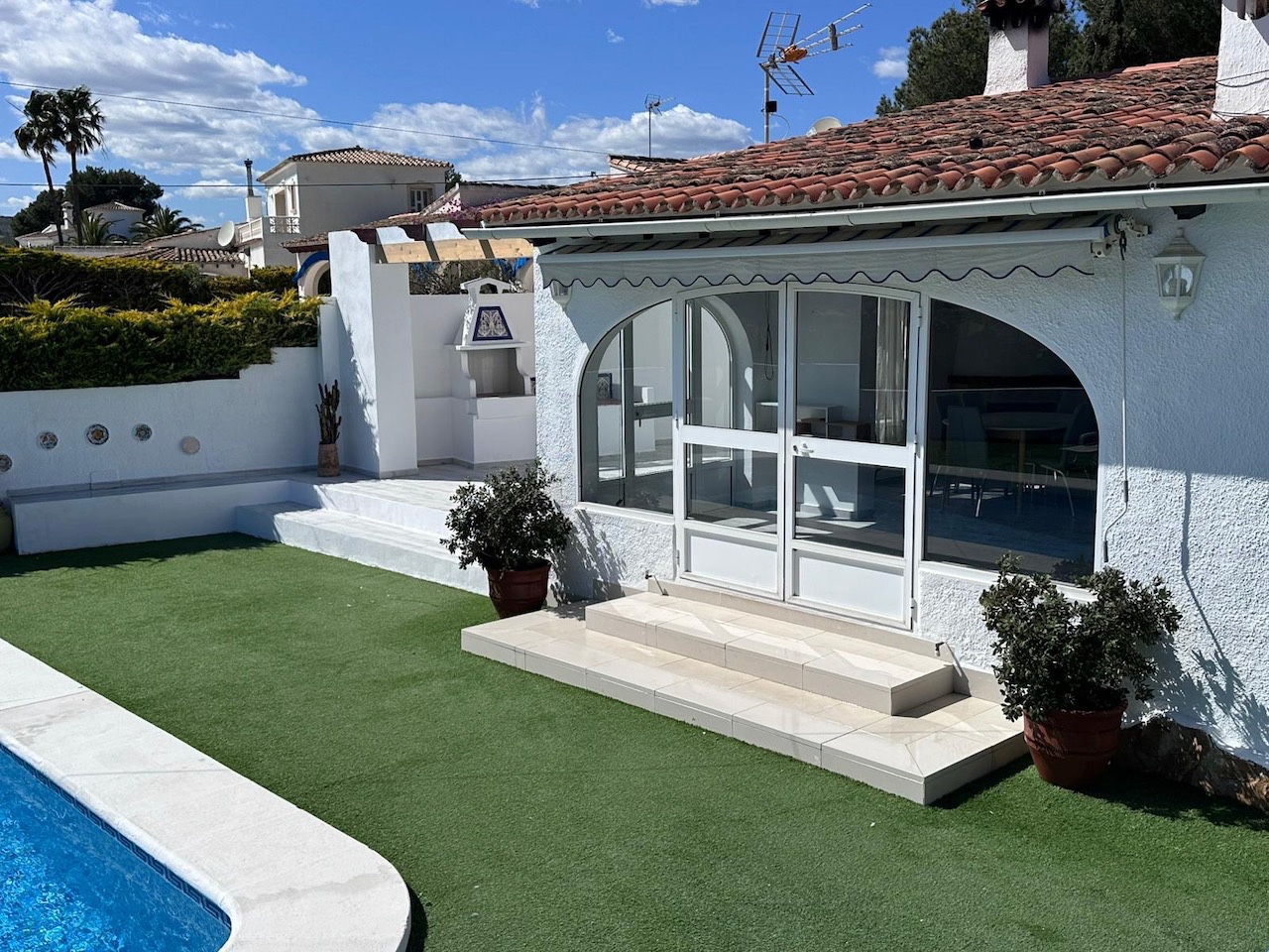 De villa heeft drie slaapkamers, allemaal voorzien van airconditioning, een gerenoveerde badkamer met inloopdouche en een extra gastentoilet. De indeling is ideaal voor zowel permanent wonen als vakanties, met alle belangrijke leefruimtes handig op hetzelfde niveau.