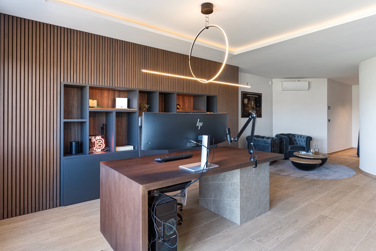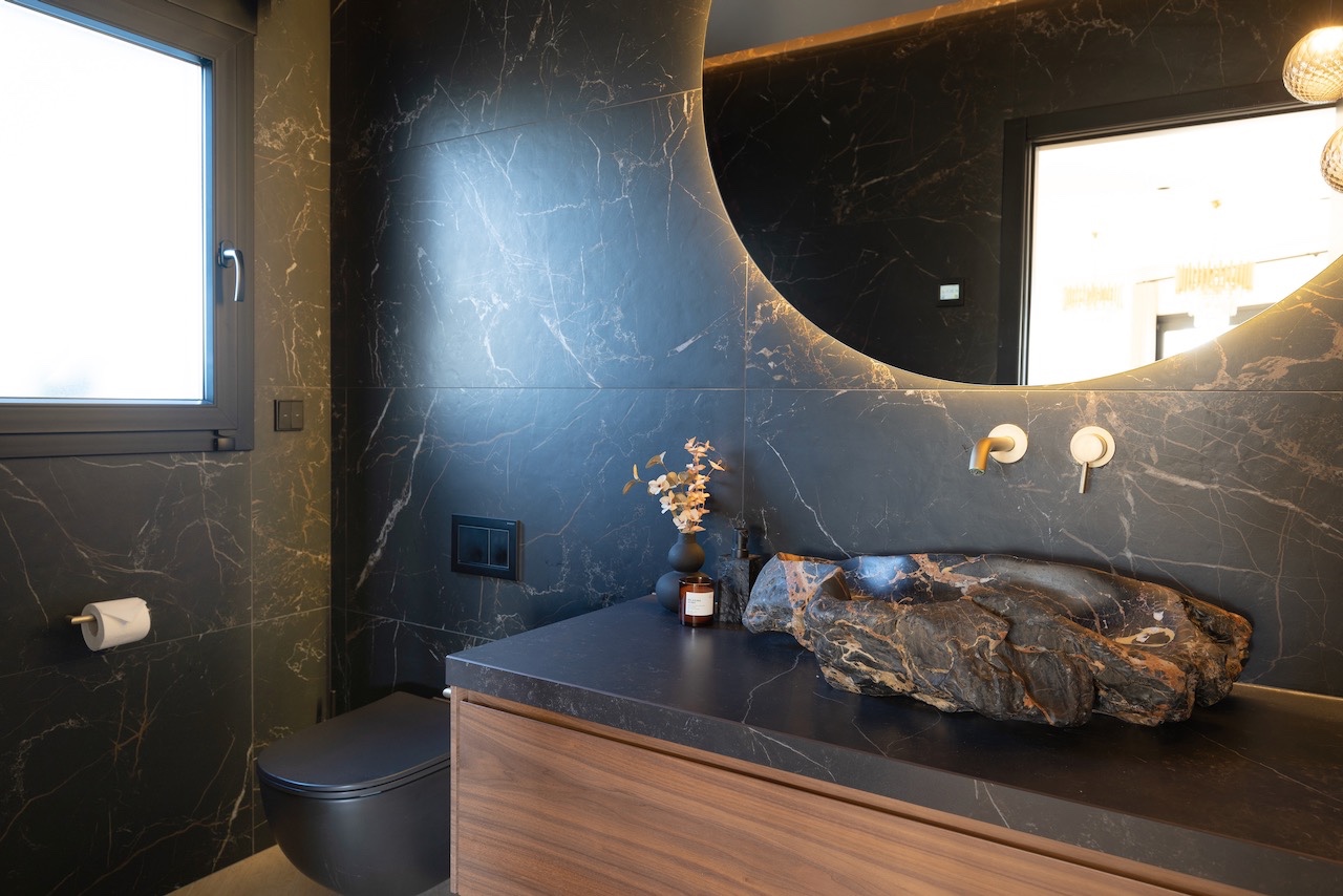 Op deze verdieping bevindt zich ook een gastentoilet. Op de onderste verdieping zijn twee ruime slaapkamers, elk met een en-suite badkamer, evenals een veelzijdige studio met keuken en werkruimte, ideaal voor gasten of als extra slaapkamer.