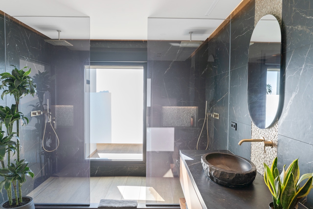 De bovenverdieping is gewijd aan de ruime master bedroom met ingebouwde kasten en een moderne en-suite badkamer met dubbele douche, evenals een extra slaapkamer met eigen badkamer.