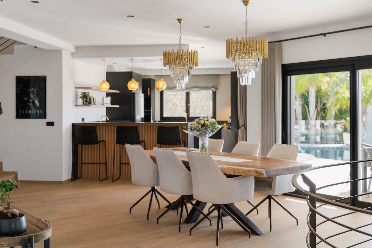 Bij binnenkomst wordt u verwelkomd in een lichte hal die leidt naar een stijlvolle open woonruimte, waar de keuken, eetkamer en woonkamer naadloos in elkaar overlopen. De keuken is voorzien van een ontbijtbar, voorraadruimte en een aparte wasruimte, terwijl de woonkamer beschikt over een elegante elektrische haard. Grote ramen van vloer tot plafond geven toegang tot een ruim terras met eetgedeelte, lounge en privézwembad.