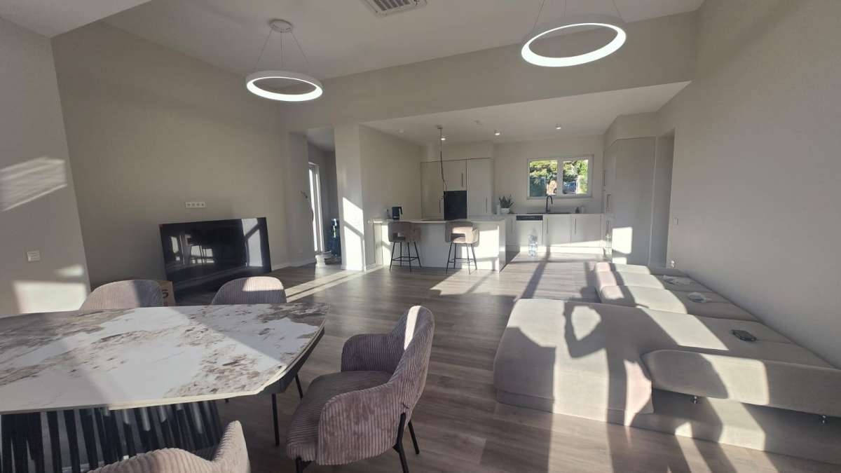 Een ruime woonkamer grenst aan een open woonkeuken die volledig is uitgerust met de nieuwste apparatuur en geschikte marmeren werkbladen. De woonkamer komt uit op een overdekt terras, met een eetruimte buiten, om te genieten van de natuur en het zwembad.br>br>