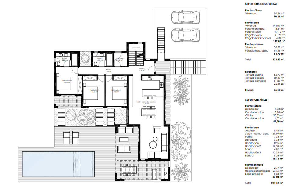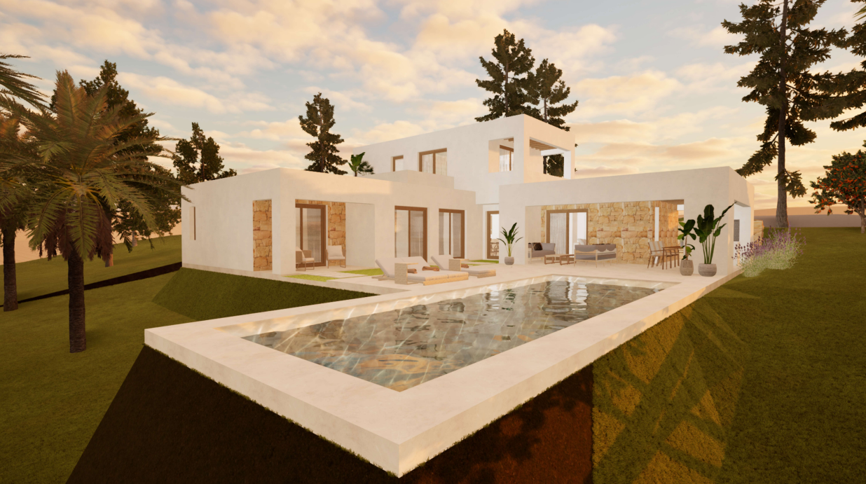 Modern Villa Project located in Jávea – Valle del Sol, just a short drive from Arenal Beach. This contemporary villa is set on a flat plot of 1,000 m² and features a spacious, open-plan living and dining area with a fully equipped open kitchen. The villa offers 4 bedrooms, 3 bathrooms (2 of them en-suite), an office room, storage, and parking for 2 cars. Hot/cold air conditioning and shutters are included. Enjoy a lovely outdoor area with a swimming pool 10.00 x 3.50 m (with beach 2.00 x 3.50 m) and a solar shower. Optional extras: Underfloor heating Pool cover andamp; pool heating Outdoor kitchen Gardening not included Contact us now for more information.