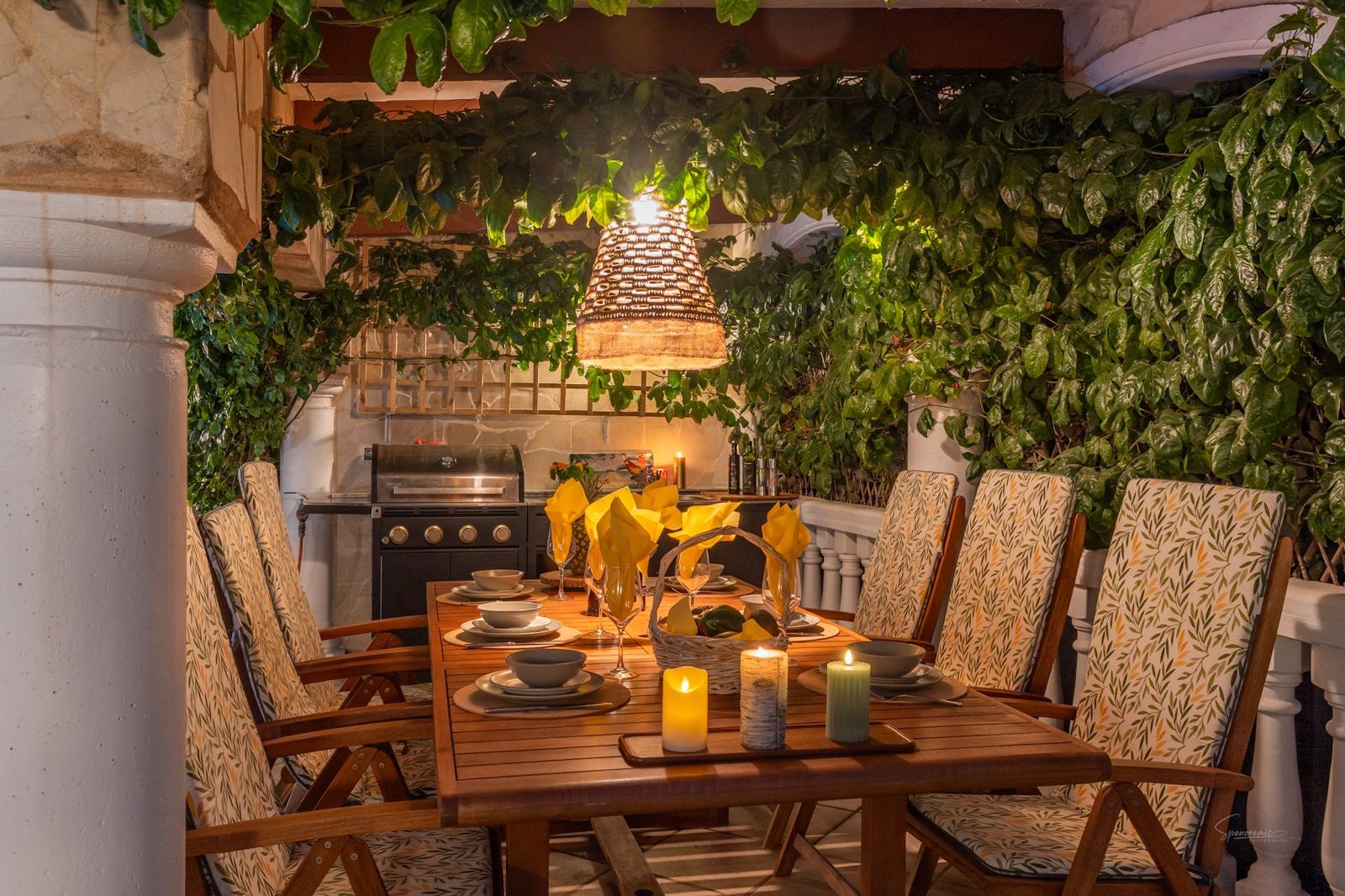 De buitenruimte is ontworpen voor de veeleisende levensgenieter. Het hart van de tuin is het unieke L-vormige zoutwaterzwembad (9×8 m), aangevuld met een volledig uitgeruste zomerkeuken. Met barbecue en warm/koud stromend water is dit de perfecte setting voor onvergetelijke diners in de buitenlucht.