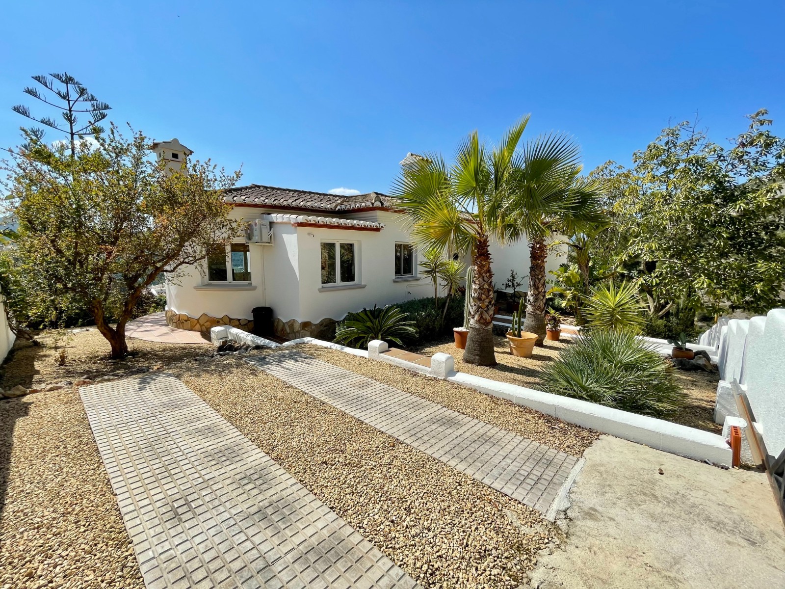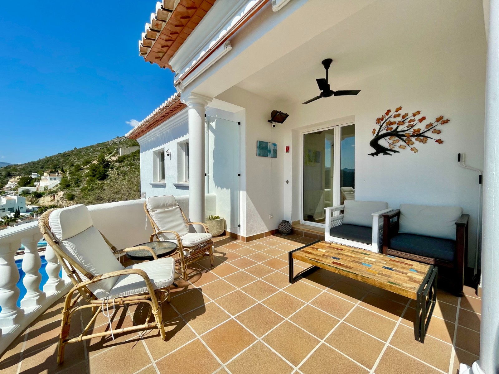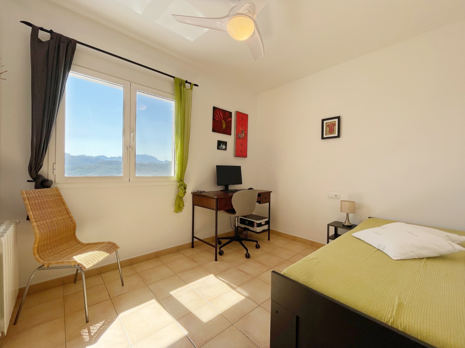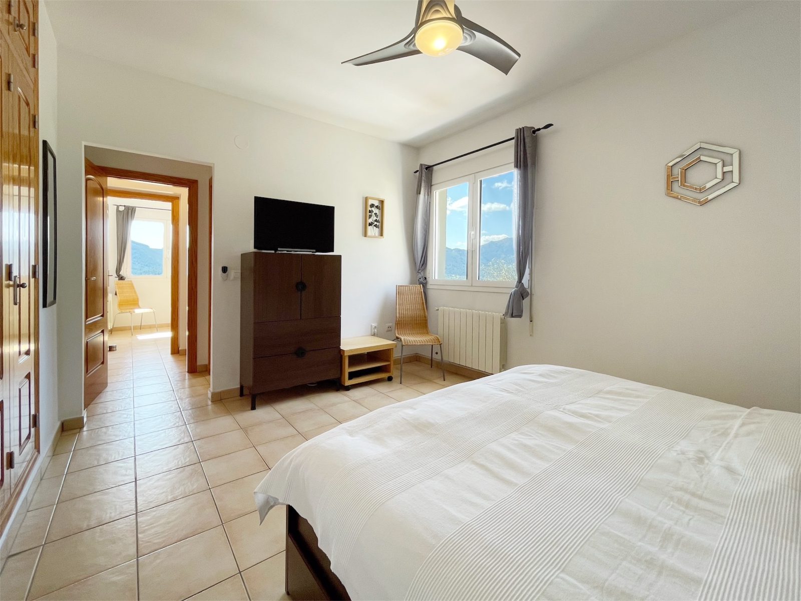 Vanaf de straat biedt een poort toegang tot een afsluitbare privé parkeerplaats op eigen terrein en een separate voetgangerspoort leidt via de voortuin direct naar woongedeelte van de woning dat zich volledig op één niveau bevindt. Via de hal betreedt u de lichte woon-/eetkamer met volledig ingerichte open keuken, die verbonden is met een gesloten bijkeuken waar we o.a. ook de wasmachine. Verder vinden we op dit niveau ook een hoofd slaapkamer met een en-suite badkamer, 2 slaapkamers en een separate badkamer. Eén van deze slaapkamers is momenteel in gebruik als kantoor. Alle slaapkamers zijn voorzien van inbouwkasten, rolluiken, plafondventilatoren en horren. De woonkamer is direct verbonden met het zuid georiënteerde en gedeeltelijk overdekte terras, tevens voorzien van zonwering, vanwaar het weidse uitzicht over het dorp en de vallei. Vanaf het terras bereiken we met een trap het lager gelegen ruime zwembadterras met het verwarmde 8 x 4 M. zwembad, een buitenkeuken, buitendouche, veel privacy en diverse zitjes. Ook betreden we via dit terras de onder verdieping met een ruim gastenverblijf, bestaande uit een woonkamer met open keuken, een slaapkamer met een aansluitende kleedkamer en een separate badkamer. Ook vinden we hier nog een ruime bergruimte. De volwassen, onderhoudsarme tuin is voorzien van sfeervolle verlichting.