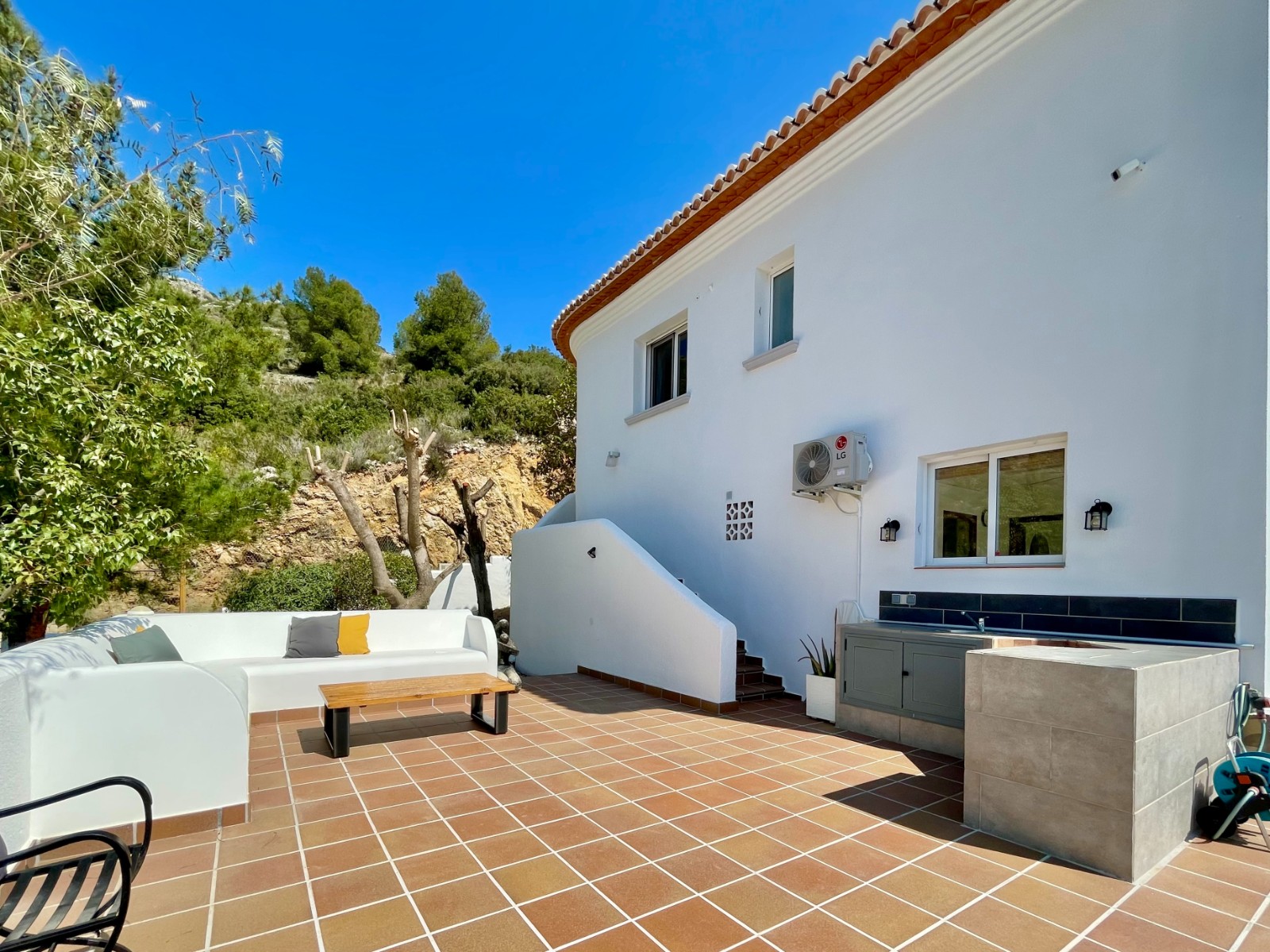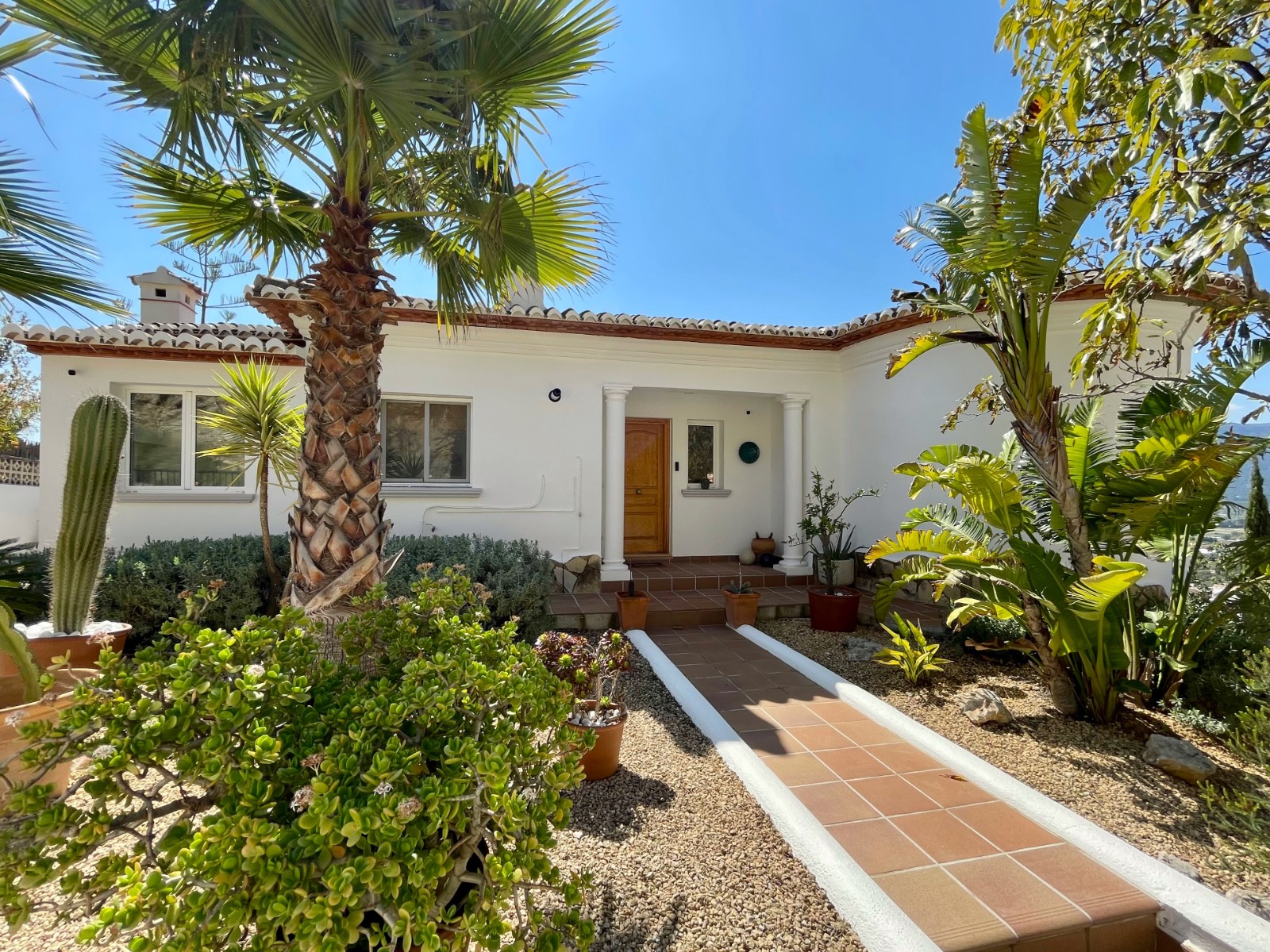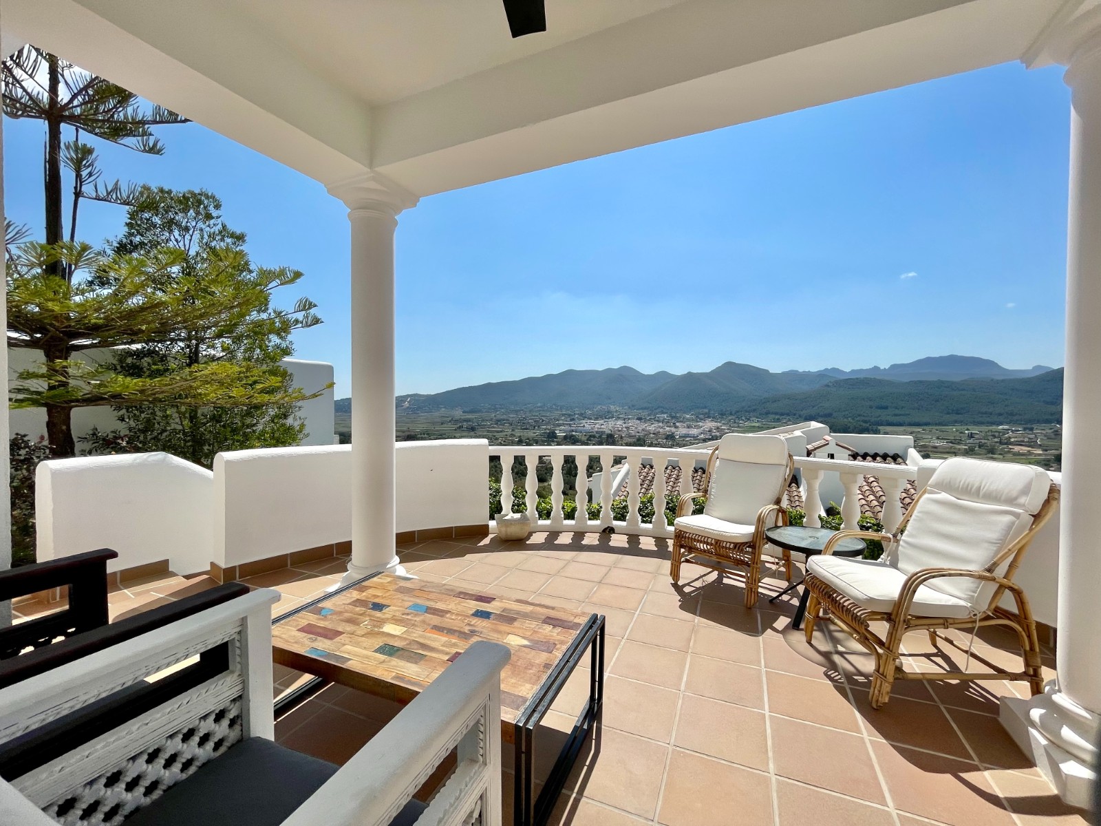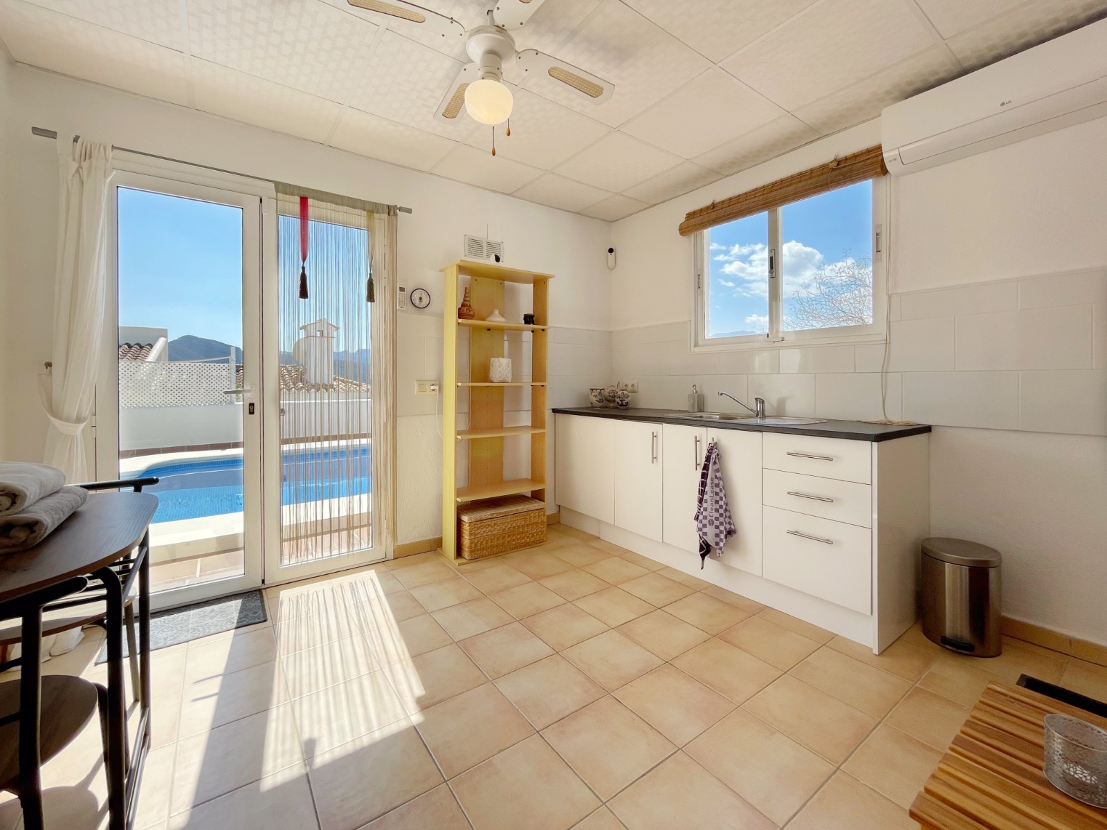 Vanaf de straat biedt een poort toegang tot een afsluitbare privé parkeerplaats op eigen terrein en een separate voetgangerspoort leidt via de voortuin direct naar woongedeelte van de woning dat zich volledig op één niveau bevindt. Via de hal betreedt u de lichte woon-/eetkamer met volledig ingerichte open keuken, die verbonden is met een gesloten bijkeuken waar we o.a. ook de wasmachine. Verder vinden we op dit niveau ook een hoofd slaapkamer met een en-suite badkamer, 2 slaapkamers en een separate badkamer. Eén van deze slaapkamers is momenteel in gebruik als kantoor. Alle slaapkamers zijn voorzien van inbouwkasten, rolluiken, plafondventilatoren en horren. De woonkamer is direct verbonden met het zuid georiënteerde en gedeeltelijk overdekte terras, tevens voorzien van zonwering, vanwaar het weidse uitzicht over het dorp en de vallei. Vanaf het terras bereiken we met een trap het lager gelegen ruime zwembadterras met het verwarmde 8 x 4 M. zwembad, een buitenkeuken, buitendouche, veel privacy en diverse zitjes. Ook betreden we via dit terras de onder verdieping met een ruim gastenverblijf, bestaande uit een woonkamer met open keuken, een slaapkamer met een aansluitende kleedkamer en een separate badkamer. Ook vinden we hier nog een ruime bergruimte. De volwassen, onderhoudsarme tuin is voorzien van sfeervolle verlichting.