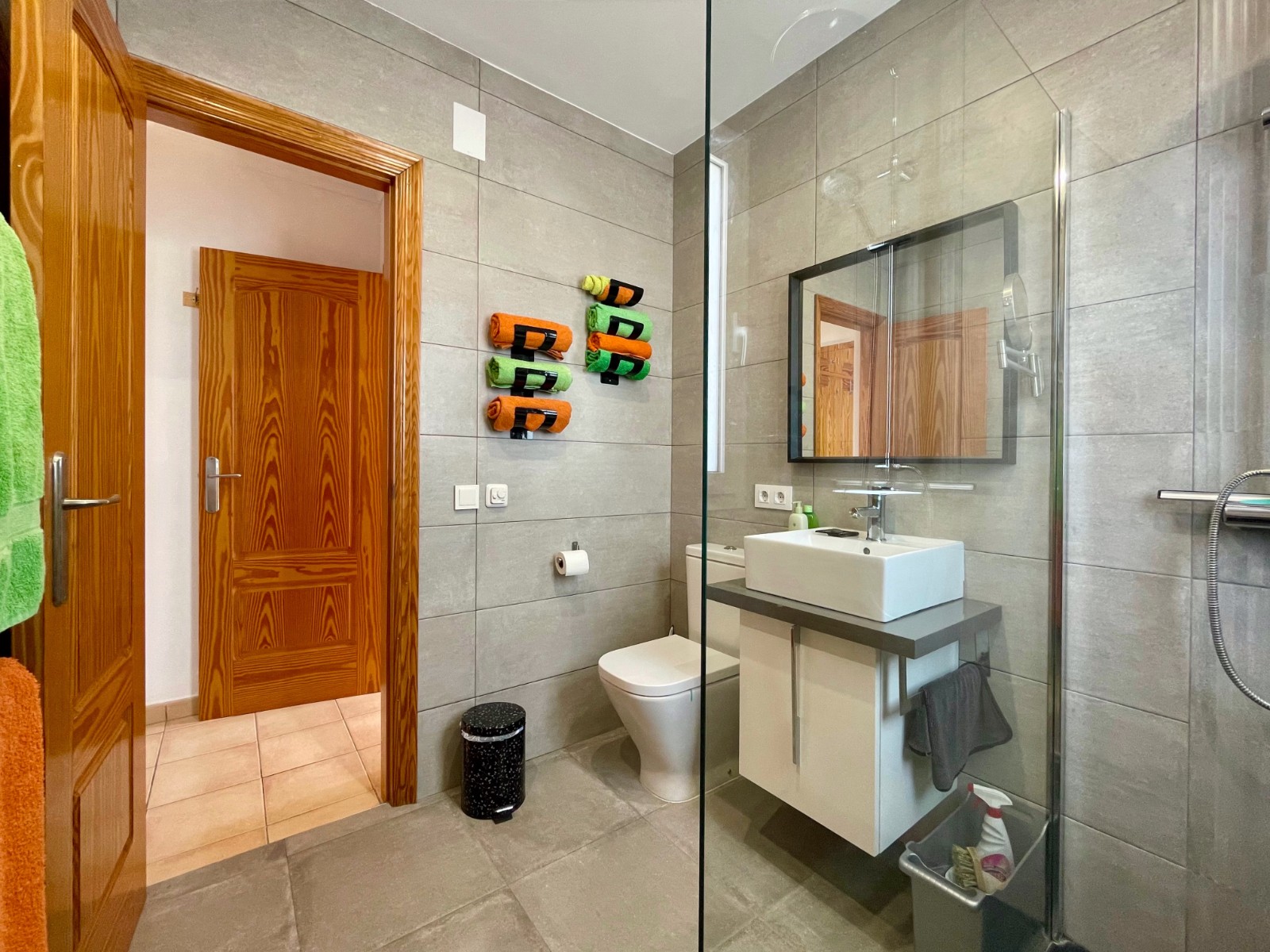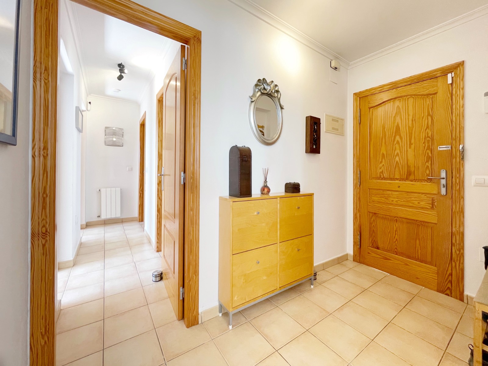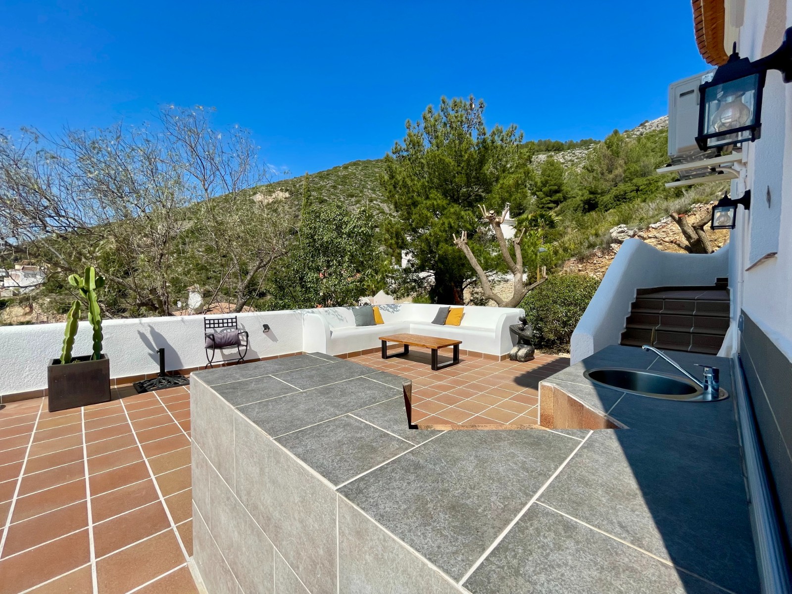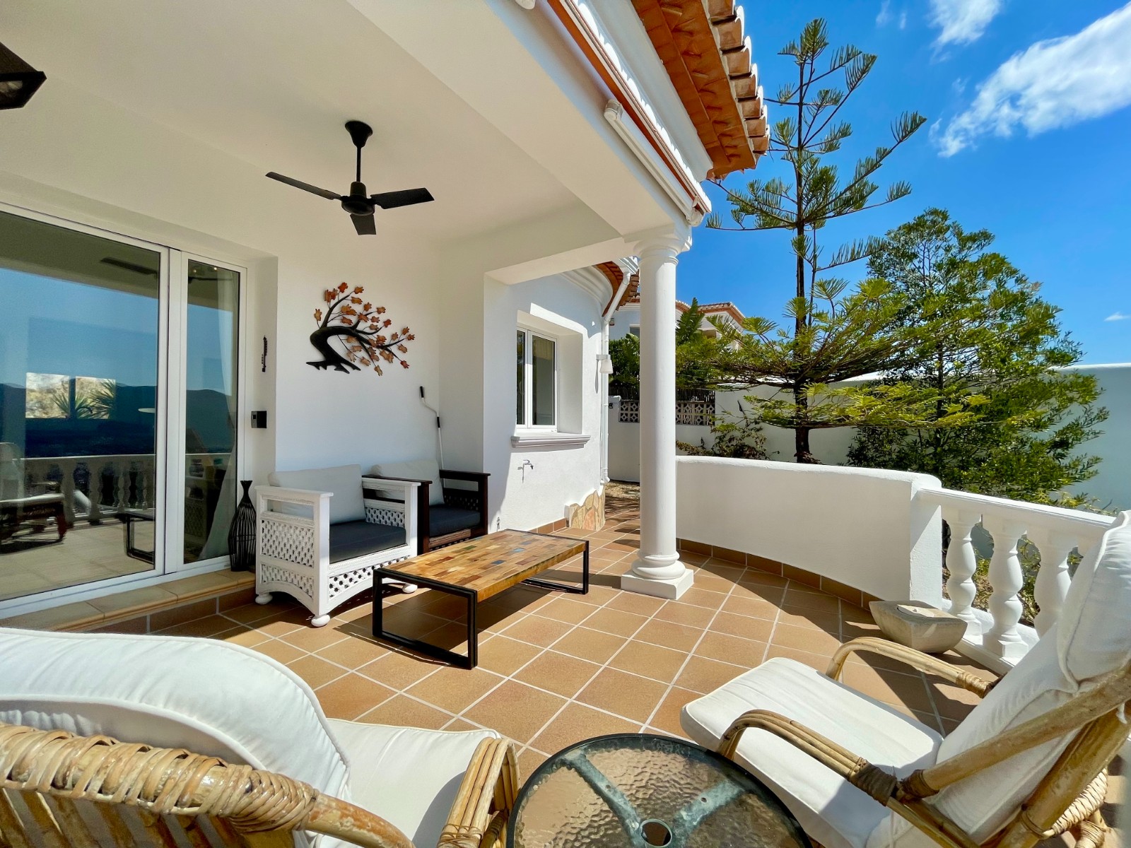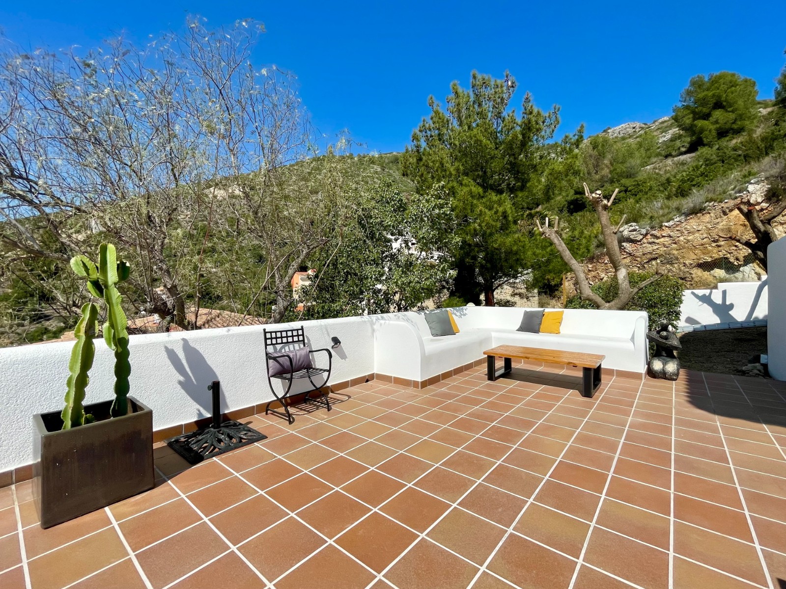 Vanaf de straat biedt een poort toegang tot een afsluitbare privé parkeerplaats op eigen terrein en een separate voetgangerspoort leidt via de voortuin direct naar woongedeelte van de woning dat zich volledig op één niveau bevindt. Via de hal betreedt u de lichte woon-/eetkamer met volledig ingerichte open keuken, die verbonden is met een gesloten bijkeuken waar we o.a. ook de wasmachine. Verder vinden we op dit niveau ook een hoofd slaapkamer met een en-suite badkamer, 2 slaapkamers en een separate badkamer. Eén van deze slaapkamers is momenteel in gebruik als kantoor. Alle slaapkamers zijn voorzien van inbouwkasten, rolluiken, plafondventilatoren en horren. De woonkamer is direct verbonden met het zuid georiënteerde en gedeeltelijk overdekte terras, tevens voorzien van zonwering, vanwaar het weidse uitzicht over het dorp en de vallei. Vanaf het terras bereiken we met een trap het lager gelegen ruime zwembadterras met het verwarmde 8 x 4 M. zwembad, een buitenkeuken, buitendouche, veel privacy en diverse zitjes. Ook betreden we via dit terras de onder verdieping met een ruim gastenverblijf, bestaande uit een woonkamer met open keuken, een slaapkamer met een aansluitende kleedkamer en een separate badkamer. Ook vinden we hier nog een ruime bergruimte. De volwassen, onderhoudsarme tuin is voorzien van sfeervolle verlichting.