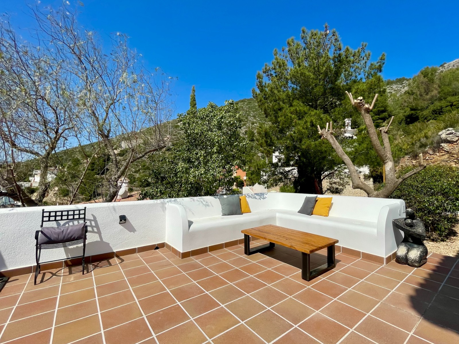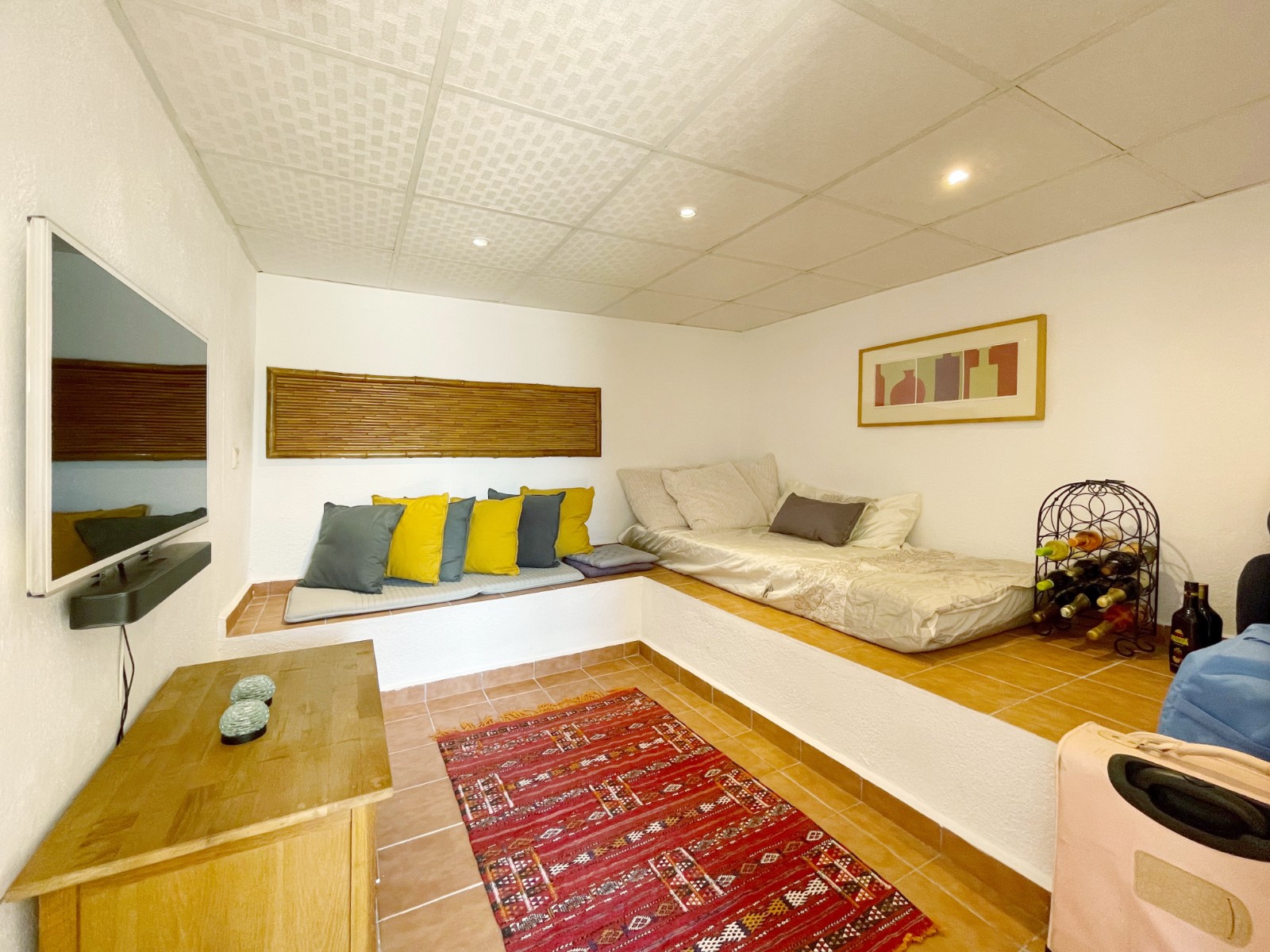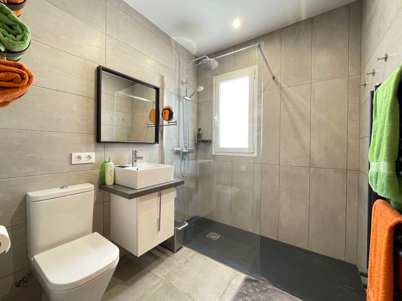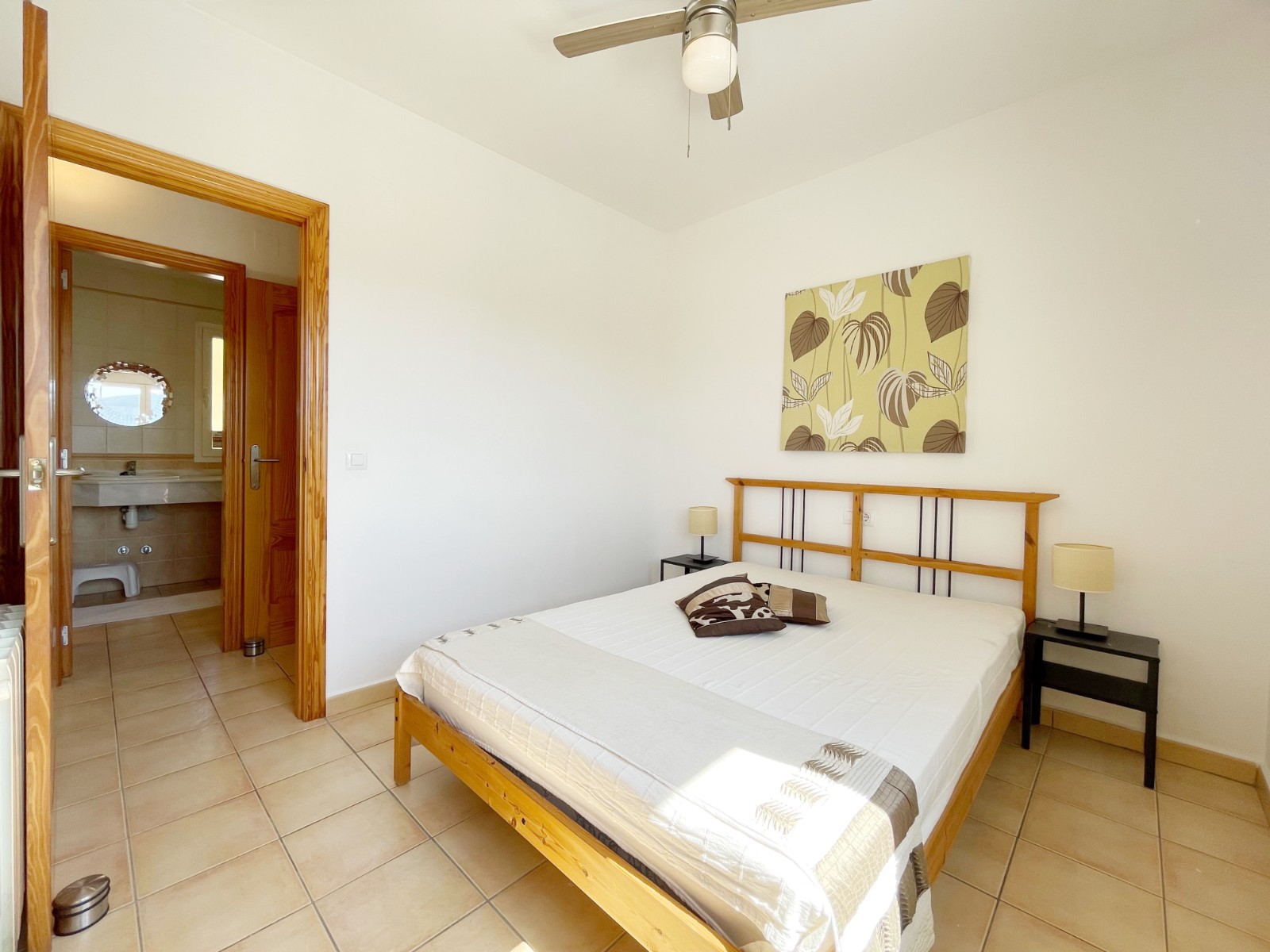 Vanaf de straat biedt een poort toegang tot een afsluitbare privé parkeerplaats op eigen terrein en een separate voetgangerspoort leidt via de voortuin direct naar woongedeelte van de woning dat zich volledig op één niveau bevindt. Via de hal betreedt u de lichte woon-/eetkamer met volledig ingerichte open keuken, die verbonden is met een gesloten bijkeuken waar we o.a. ook de wasmachine. Verder vinden we op dit niveau ook een hoofd slaapkamer met een en-suite badkamer, 2 slaapkamers en een separate badkamer. Eén van deze slaapkamers is momenteel in gebruik als kantoor. Alle slaapkamers zijn voorzien van inbouwkasten, rolluiken, plafondventilatoren en horren. De woonkamer is direct verbonden met het zuid georiënteerde en gedeeltelijk overdekte terras, tevens voorzien van zonwering, vanwaar het weidse uitzicht over het dorp en de vallei. Vanaf het terras bereiken we met een trap het lager gelegen ruime zwembadterras met het verwarmde 8 x 4 M. zwembad, een buitenkeuken, buitendouche, veel privacy en diverse zitjes. Ook betreden we via dit terras de onder verdieping met een ruim gastenverblijf, bestaande uit een woonkamer met open keuken, een slaapkamer met een aansluitende kleedkamer en een separate badkamer. Ook vinden we hier nog een ruime bergruimte. De volwassen, onderhoudsarme tuin is voorzien van sfeervolle verlichting.