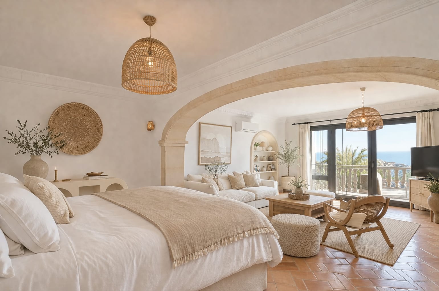 As you arrive, the villa welcomes you through a beautifully landscaped Mediterranean garden along the main driveway, revealing panoramic sea views that stretch from Moraira to Calpe. Designed for both luxury living and entertaining, the estate is divided into a main house, a guest house (which can be seamlessly connected to the main residence), and a separate studio, offering flexibility for family, guests, or staff.